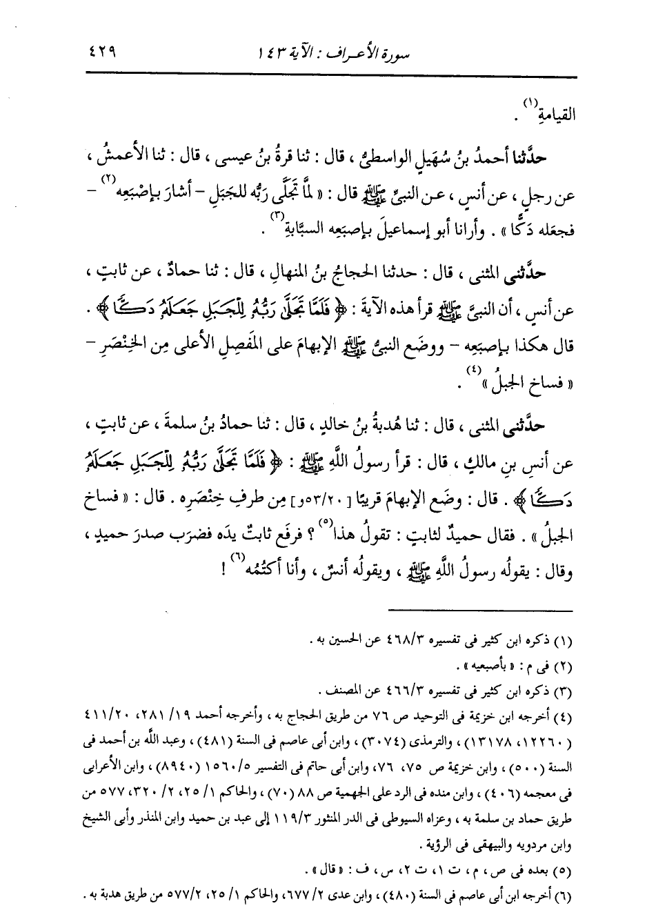 حَدَّثَنِي الْمُثَنَّى، قَالَ: ثني الْحَجَّاجُ بْنُ الْمِنْهَالِ، قَالَ: ثنا حَمَّادٌ، عَنْ ثَابِتٍ، عَنْ أَنَسٍ: أَنَّ النَّبِيَّ صَلَّى اللهُ عَلَيْهِ وَسَلَّمَ قَرَأَ هَذِهِ الْآيَةَ: {§فَلَمَّا تَجَلَّى رَبُّهُ لِلْجَبَلِ جَعَلَهُ دَكًّا} [الأعراف: 143] قَالَ: «هَكَذَا» بِأُصْبُعِهِ وَوَضَعَ النَّبِيُّ صَلَّى اللهُ عَلَيْهِ وَسَلَّمَ الْإِبْهَامَ عَلَى الْمِفْصَلِ الْأَعْلَى مِنَ الْخِنْصَرِ، «فَسَاخَ الْجَبَلُ»