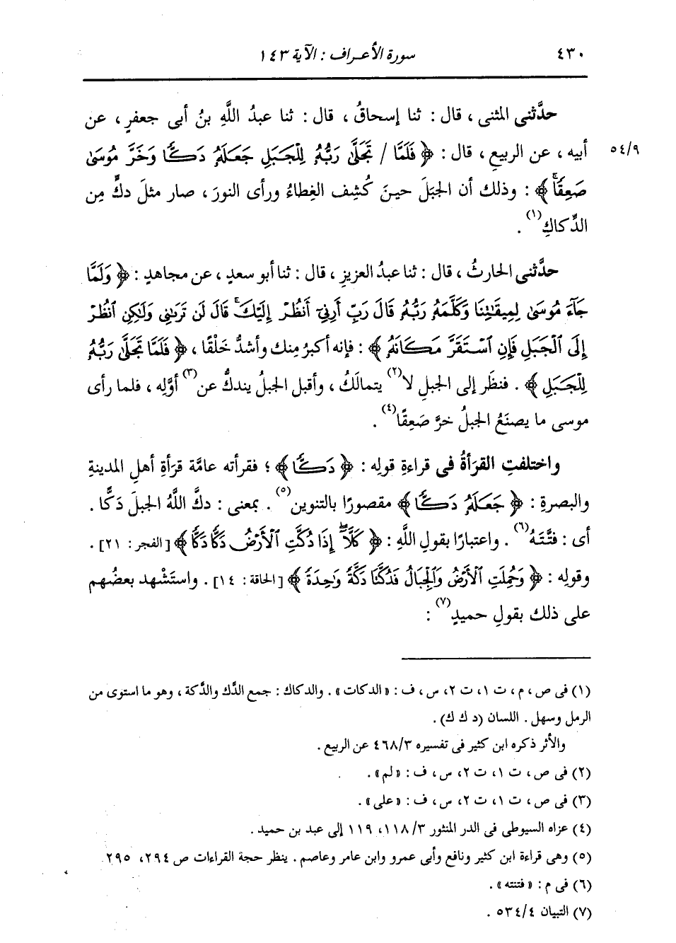 حَدَّثَنَا الْحَارِثُ، قَالَ: ثنا عَبْدُ الْعَزِيزِ، قَالَ: ثنا أَبُو سَعْدٍ، عَنْ مُجَاهِدٍ: " {§وَلَمَّا جَاءَ مُوسَى لِمِيقَاتِنَا وَكَلَّمَهُ رَبُّهُ قَالَ رَبِّ أَرِنِي أَنْظُرْ إِلَيْكَ قَالَ لَنْ تَرَانِي وَلَكِنِ انْظُرْ إِلَى الْجَبَلِ فَإِنِ اسْتَقَرَّ مَكَانَهُ} [الأعراف: 143] فَإِنَّهُ أَكْبَرُ مِنْكَ وَأَشَدُّ خَلْقًا. {فَلَمَّا تَجَلَّى رَبُّهُ لِلْجَبَلِ} [الأعراف: 143] فَنَظَرَ إِلَى الْجَبَلِ لَا يَتَمَالَكُ، وَأَقْبَلَ الْجَبَلُ يَنْدَكُّ عَلَى أَوَّلِهِ فَلَمَّا رَأَى مُوسَى مَا يَصْنَعُ الْجَبَلُ خَرَّ صَعِقًا " وَاخْتَلَفَتِ الْقُرَّاءُ فِي قِرَاءَةِ قَوْلِهِ: {دَكًّا} [الأعراف: 143] فَقَرَأَتْهُ عَامَّةُ قُرَّاءِ أَهْلِ الْمَدِينَةِ وَالْبَصْرَةِ: {دَكًّا} [الأعراف: 143] مَقْصُورًا بِالتَّنْوِينِ، بِمَعْنَى: دَكَّ اللَّهُ الْجَبَلَ دَكًّا أَيْ: فَتَّتَهُ، وَاعْتِبَارًا بِقَوْلِ اللَّهِ: {كَلَّا إِذَا دُكَّتِ الْأَرْضُ دَكًّا دَكًّا} [الفجر: 21] ، وَقَوْلُهُ: {وَحُمِلَتِ الْأَرْضُ وَالْجِبَالُ فَدُكَّتَا دَكَّةً وَاحِدَةً} [الحاقة: 14] وَاسْتَشْهَدَ بَعْضُهُمْ عَلَى ذَلِكَ بِقَوْلِ حُمَيْدٍ: