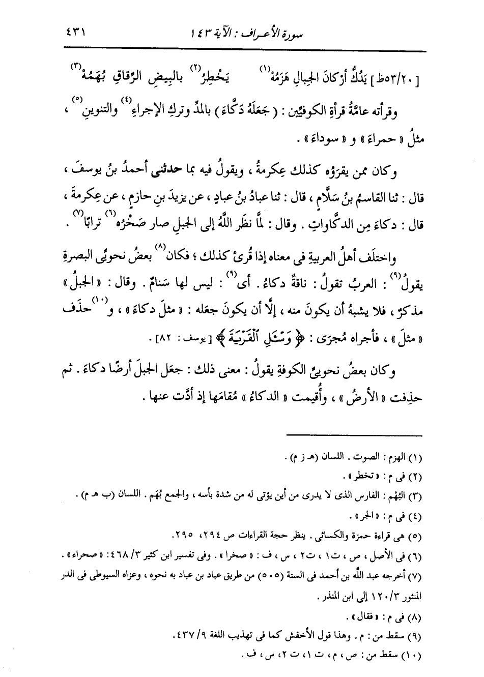 حَدَّثَنِي بِهِ أَحْمَدُ بْنُ يُوسُفَ، قَالَ: ثنا الْقَاسِمُ بْنُ سَلَّامٍ، قَالَ: ثنا عَبَّادُ بْنُ عَبَّادٍ، عَنْ يَزِيدَ بْنِ حَازِمٍ، عَنْ عِكْرِمَةَ، قَالَ: " §دَكَّاءُ مِنَ الدَّكَّاوَاتِ. وَقَالَ: لَمَّا نَظَرَ اللَّهُ تَبَارَكَ وَتَعَالَى إِلَى الْجَبَلِ صَارَ صَخْرَةً تُرَابًا " وَاخْتَلَفَ أَهْلُ الْعَرَبِيَّةِ فِي مَعْنَاهُ إِذَا قُرِئَ كَذَلِكَ. فَقَالَ بَعْضُ نَحْوِيِّي الْبَصْرَةِ: الْعَرَبُ تَقُولُ: نَاقَةٌ دَكَّاءُ: لَيْسَ لَهَا سَنَامٌ، وَقَالَ: الْجَبَلُ مُذَكَّرٌ، فَلَا يُشْبِهُ أَنْ يَكُونَ مِنْهُ إِلَّا أَنْ يَكُونَ: جَعَلَهُ مِثْلَ دَكَّاءَ، حَذَفَ مِثْلَ، وَأَجْرَاهُ مَجْرَى: {وَاسْأَلِ الْقَرْيَةَ} [يوسف: 82] وَكَانَ بَعْضُ نَحْوِيِّي الْكُوفَةِ يَقُولُ: مَعْنَى ذَلِكَ: جَعَلَ الْجَبَلَ أَرْضًا دَكَّاءَ، ثُمَّ حُذِفَتِ الْأَرْضُ وَأُقِيمَتِ الدَّكَّاءُ مُقَامَهَا إِذْ أَدَّتْ عَنْهَا.