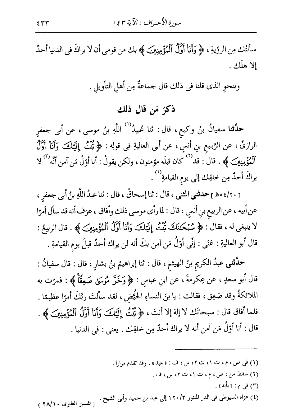 حَدَّثَنَا ابْنُ وَكِيعٍ، قَالَ: ثنا عُبَيْدُ اللَّهِ بْنُ مُوسَى، عَنْ أَبِي جَعْفَرٍ الرَّازِيِّ، عَنِ الرَّبِيعِ بْنِ أَنَسٍ، عَنْ أَبِي الْعَالِيَةِ، فِي قَوْلِهِ: " {§تُبْتُ إِلَيْكَ وَأَنَا أَوَّلُ الْمُؤْمِنِينَ،} [الأعراف: 143] قَالَ: كَانَ قَبْلَهُ مُؤْمِنُونَ، وَلَكِنْ يَقُولُ: أَنَا أَوَّلُ مَنْ آمَنَ بِأَنَّهُ لَا يَرَاكَ أَحَدٌ مِنْ خَلَقِكَ إِلَى يَوْمِ الْقِيَامَةِ "