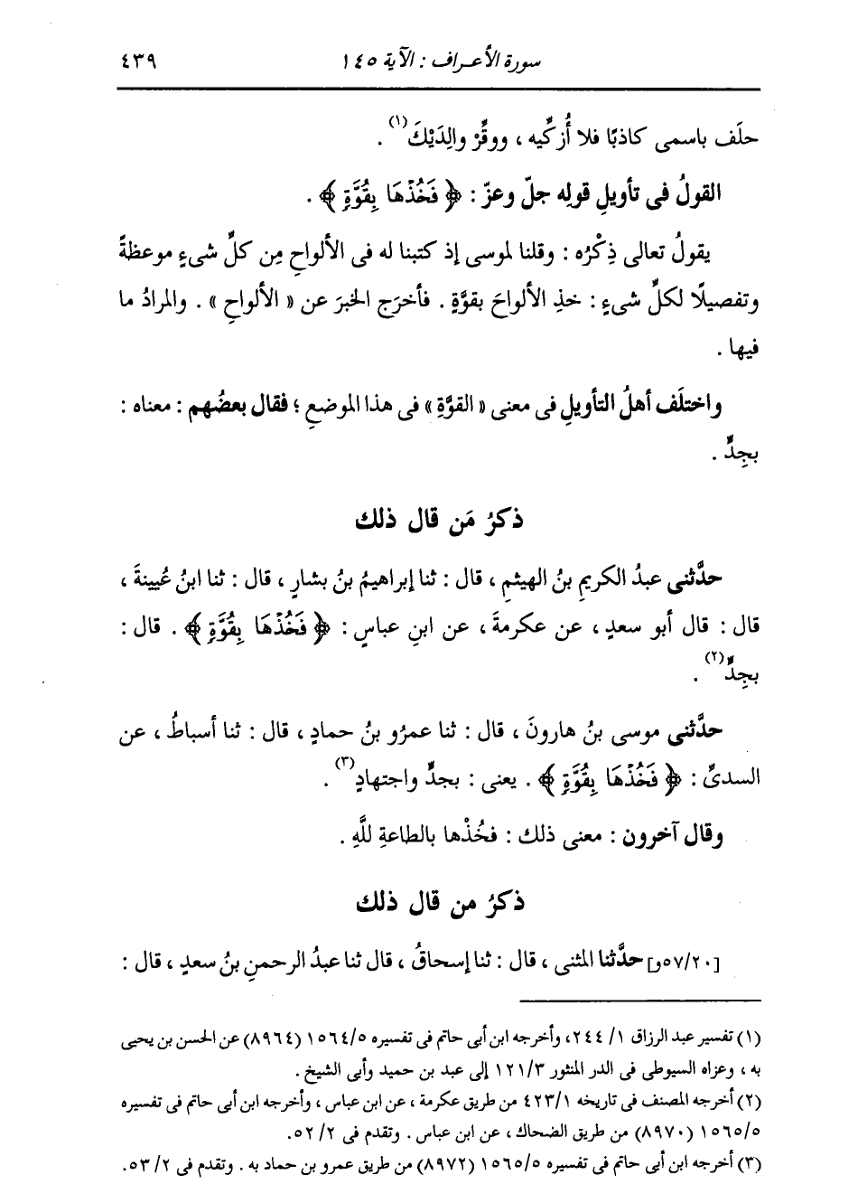 حَدَّثَنِي الْمُثَنَّى، قَالَ: ثنا إِسْحَاقُ، قَالَ: ثنا عَبْدُ الرَّحْمَنِ بْنُ سَعْدٍ، قَالَ: -[440]- أَخْبَرَنَا أَبُو جَعْفَرٍ، عَنِ الرَّبِيعِ بْنِ أَنَسٍ، فِي قَوْلِهِ: " {§فَخُذْهَا بِقُوَّةٍ} [الأعراف: 145] قَالَ: بِالطَّاعَةِ " وَقَدْ بَيَّنَّا مَعْنَى ذَلِكَ بِشَوَاهِدِهِ وَاخْتِلَافِ أَهْلِ التَّأْوِيلِ فِيهِ فِي سُورَةِ الْبَقَرَةِ عِنْدَ قَوْلِهِ: {خُذُوا مَا آتَيْنَاكُمْ بِقُوَّةٍ} [البقرة: 63] فَأَغْنَى ذَلِكَ عَنْ إِعَادَتِهِ فِي هَذَا الْمَوْضِعِ