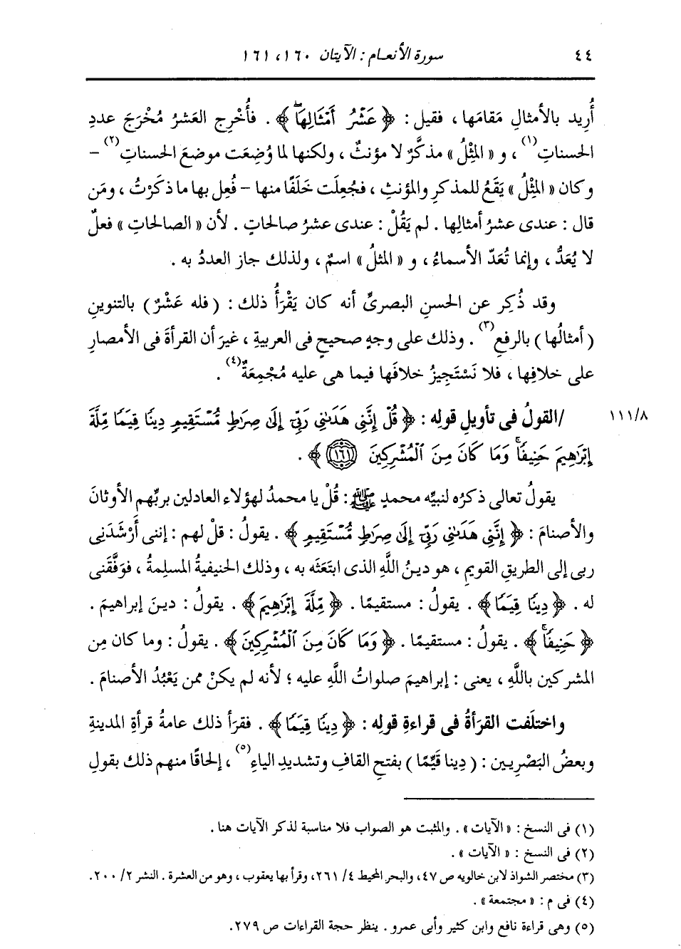 §الْقَوْلُ فِي تَأْوِيلِ قَوْلِهِ تَعَالَى: {قُلْ إِنَّنِي هَدَانِي رَبِّي إِلَى صِرَاطٍ مُسْتَقِيمٍ دِينًا قِيَمًا مِلَّةَ إِبْرَاهِيمَ حَنِيفًا وَمَا كَانَ مِنَ الْمُشْرِكِينَ} [الأنعام: 161] يَقُولُ تَعَالَى ذِكْرُهُ لِنَبِيِّهِ مُحَمَّدٍ صَلَّى اللهُ عَلَيْهِ وَسَلَّمَ: {قُلْ} [البقرة: 80] يَا مُحَمَّدُ لِهَؤُلَاءِ الْعَادِلِينَ بِرَبِّهِمُ الْأَوْثَانَ وَالْأَصْنَامَ: {إِنَّنِي هَدَانِي رَبِّي إِلَى صِرَاطٍ مُسْتَقِيمٍ} [الأنعام: 161] يَقُولُ: قُلْ لَهُمْ: إِنَّنِي أَرْشَدَنِي رَبِّي إِلَى الطَّرِيقِ الْقَوِيمِ، هُوَ دِينُ اللَّهِ الَّذِي ابْتَعَثَهُ بِهِ، وَذَلِكَ الْحَنِيفِيَّةُ الْمُسْلِمَةُ، فَوَفَّقَنِي لَهُ. {دِينًا قِيَمًا} [الأنعام: 161] يَقُولُ: مُسْتَقِيمًا. {مِلَّةَ إِبْرَاهِيمَ} [البقرة: 130] يَقُولُ: دِينَ إِبْرَاهِيمَ. {حَنِيفًا} [البقرة: 135] يَقُولُ: مُسْتَقِيمًا. {وَمَا كَانَ مِنَ الْمُشْرِكِينَ} [البقرة: 135] يَقُولُ: وَمَا كَانَ مِنَ الْمُشْرِكِينَ بِاللَّهِ، يَعْنِي إِبْرَاهِيمَ صَلَوَاتُ اللَّهِ عَلَيْهِ، لِأَنَّهُ لَمْ يَكُنْ مِمَّنْ يَعْبُدُ الْأَصْنَامَ. وَاخْتَلَفَتِ الْقُرَّاءُ فِي قِرَاءَةِ قَوْلِهِ: {دِينًا قِيَمًا} [الأنعام: 161] ، فَقَرَأَ ذَلِكَ عَامَّةُ قُرَّاءِ الْمَدِينَةِ وَبَعْضُ الْبَصْرِيِّينَ: (دِينًا قَيِّمًا) بِفَتْحِ الْقَافِ وَتَشْدِيدِ الْيَاءِ إِلْحَاقًا مِنْهُمْ ذَلِكَ بِقَوْلِ