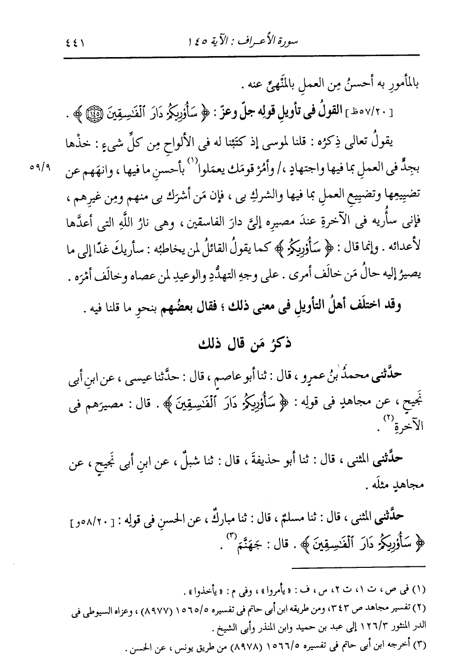 حَدَّثَنِي مُحَمَّدُ بْنُ عَمْرٍو، قَالَ: ثنا أَبُو عَاصِمٍ، قَالَ: ثني عِيسَى، عَنِ ابْنِ أَبِي نَجِيحٍ، عَنْ مُجَاهِدٍ، فِي قَوْلِهِ: " {§سَأُرِيكُمْ دَارَ الْفَاسِقِينَ} [الأعراف: 145] قَالَ: مَصِيرُهُمْ فِي الْآخِرَةِ " حَدَّثَنِي الْمُثَنَّى، قَالَ: ثنا أَبُو حُذَيْفَةَ، قَالَ: ثنا شِبْلٌ، عَنِ ابْنِ أَبِي نَجِيحٍ عَنْ مُجَاهِدٍ مِثْلَهُ