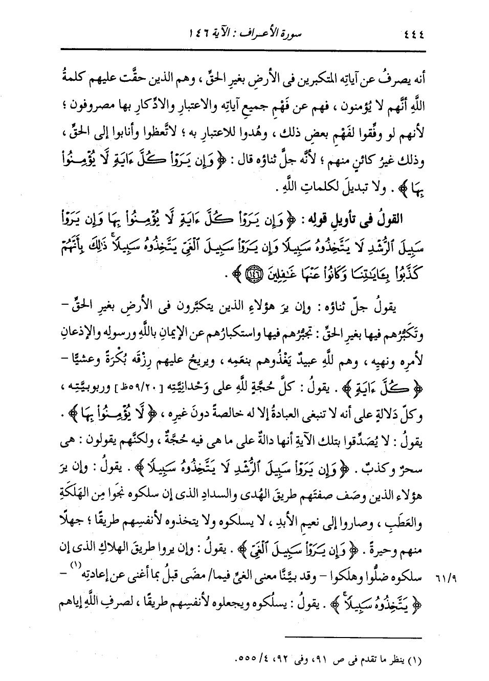 §الْقَوْلُ فِي تَأْوِيلِ قَوْلِهِ تَعَالَى: {وَإِنْ يَرَوْا كُلَّ آيَةٍ لَا يُؤْمِنُوا بِهَا وَإِنْ يَرَوْا سَبِيلَ الرُّشْدِ لَا يَتَّخِذُوهُ سَبِيلًا وَإِنْ يَرَوْا سَبِيلَ الْغَيِّ يَتَّخِذُوهُ سَبِيلًا ذَلِكَ بِأَنَّهُمْ كَذَّبُوا بِآيَاتِنَا وَكَانُوا عَنْهَا غَافِلِينَ} [الأعراف: 146] يَقُولُ تَعَالَى ذِكْرُهُ: وَإِنَّ هَؤُلَاءِ الَّذِينَ يَتَكَبَّرُونَ فِي الْأَرْضِ بِغَيْرِ الْحَقِّ. وَتَكَبُّرُهُمْ فِيهَا بِغَيْرِ الْحَقِّ: تَجَبُّرُهُمْ فِيهَا، وَاسْتِكْبَارُهُمْ عَنِ الْإِيمَانِ بِاللَّهِ وَرَسُولِهِ وَالْإِذْعَانِ لَأَمْرِهِ وَنَهْيِهِ، وَهُمْ لِلَّهِ عُبَيْدٌ يَغْذُوهُمْ بِنِعْمَتِهِ وَيُرِيحُ عَلَيْهِمْ رِزْقَهُ بُكْرَةً وَعَشِيًّا. {كُلَّ آيَةٍ} [الأنعام: 25] يَقُولُ: كُلَّ حُجَّةٍ لِلَّهِ عَلَى وَحْدَانِيَّتِهِ وَرُبُوبِيَّتِهِ، وَكُلَّ دَلَالَةٍ عَلَى أَنَّهُ لَا تَنْبَغِي الْعِبَادَةُ إِلَّا لَهُ خَالِصَةً دُونَ غَيْرِهِ. {لَا يُؤْمِنُوا بِهَا} [الأنعام: 25] يَقُولُ: لَا يُصَدِّقُوا بِتِلْكَ الْآيَةِ أَنَّهَا دَالَّةٌ عَلَى مَا هِيَ فِيهِ حُجَّةٌ، وَلَكِنَّهُمْ يَقُولُونَ: هِيَ سِحْرٌ وَكَذِبٌ. {وَإِنْ يَرَوْا سَبِيلَ الرُّشْدِ لَا يَتَّخِذُوهُ سَبِيلًا} [الأعراف: 146] يَقُولُ: وَإِنَّ يَرَ هَؤُلَاءِ الَّذِينَ وَصَفَ صِفَتَهُمْ طَرِيقَ الْهُدَى وَالسَّدَادِ الَّذِي إِنْ سَلَكُوهُ نَجَوْا مِنَ الْهَلَكَةِ وَالْعَطَبِ وَصَارُوا إِلَى نَعِيمِ الْأَبَدِ لَا يَسْلُكُوهُ وَلَا يَتَّخِذُوهُ لِأَنْفُسِهِمْ طَرِيقًا؛ جَهْلًا مِنْهُمْ وَحِيرَةً. {وَإِنْ يَرَوْا سَبِيلَ الْغَيِّ} [الأعراف: 146] يَقُولُ: وَإِنْ يَرَوْا طَرِيقَ الْهَلَاكِ الَّذِي إِنْ سَلَكُوهُ ضَلُّوا وَهَلَكُوا. وَقَدْ بَيَّنَّا مَعْنَى الْغَيِّ فِيمَا مَضَى قَبْلُ بِمَا أَغْنَى عَنْ إِعَادَتِهِ. {يَتَّخِذُوهُ سَبِيلًا} [الأعراف: 146] يَقُولُ: يَسْلُكُوهُ وَيَجْعَلُوهُ لِأَنْفُسِهِمْ طَرِيقًا لِصَرْفِ اللَّهِ إِيَّاهُمْ