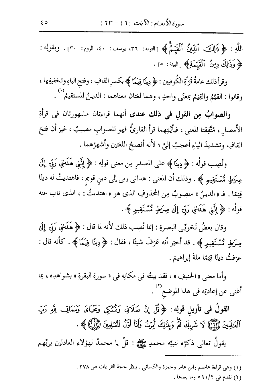 اللَّهِ: {ذَلِكَ الدِّينُ الْقَيِّمُ} [التوبة: 36] ، وَبِقَوْلِهِ: {ذَلِكَ دِينُ الْقَيِّمَةِ} [البينة: 5] ، وَقَرَأَ ذَلِكَ عَامَّةُ قُرَّاءِ الْكُوفِيِّينَ: {دِينًا قِيَمًا} [الأنعام: 161] بِكَسْرِ الْقَافِ وَفَتْحِ الْيَاءِ وَتَخْفِيفِهَا، وَقَالُوا: الْقَيِّمُ وَالْقِيَمُ بِمَعْنًى وَاحِدٍ، وَهُمْ لُغَتَانِ مَعْنَاهُمَا: الدِّينُ الْمُسْتَقِيمُ. وَالصَّوَابُ مِنَ الْقَوْلِ فِي ذَلِكَ عِنْدِي أَنَّهُمَا قِرَاءَتَانِ مَشْهُورَتَانِ فِي قِرَاءَةِ الْأَمْصَارِ، مُتَّفِقَتَا الْمَعْنَى، فَبِأَيَّتِهِمَا قَرَأَ الْقَارِئُ فَهُوَ لِلصَّوَابِ مُصِيبٌ، غَيْرَ أَنَّ فَتْحَ الْقَافِ وَتَشْدِيدَ الْيَاءِ أَعْجَبُ إِلَيَّ، لِأَنَّهُ أَفْصَحُ اللُّغَتَيْنِ وَأَشْهَرُهُمَا. وَنَصَبَ قَوْلَهُ: {دِينًا} [آل عمران: 85] عَلَى الْمَصْدَرِ مِنْ مَعْنَى قَوْلِهِ: {إِنَّنِي هَدَانِي رَبِّي إِلَى صِرَاطٍ مُسْتَقِيمٍ} [الأنعام: 161] ، وَذَلِكَ أَنَّ الْمَعْنَى هَدَانِي رَبِّي إِلَى دَيْنٍ قَوِيمٍ، فَاهْتَدَيْتُ لَهُ دِينًا قِيَمًا، فَالدِّينُ مَنْصُوبٌ مِنَ الْمَحْذُوفِ الَّذِي هُوَ (اهْتَدَيْتُ) الَّذِي نَابَ عَنْهُ قَوْلُهُ: {إِنَّنِي هَدَانِي رَبِّي إِلَى صِرَاطٍ مُسْتَقِيمٍ} [الأنعام: 161] . وَقَالَ بَعْضُ نَحْوِيِّي الْبَصْرَةِ: إِنَّمَا نُصِبَ ذَلِكَ لِأَنَّهُ لَمَّا قَالَ: {هَدَانِي رَبِّي إِلَى صِرَاطٍ مُسْتَقِيمٍ} [الأنعام: 161] قَدْ أَخْبَرَ أَنَّهُ عَرَفَ شَيْئًا، فَقَالَ: {دِينًا قِيَمًا} [الأنعام: 161] كَأَنَّهُ قَالَ: عَرَفْتُ دِينًا قِيَمًا مِلَّةَ إِبْرَاهِيمَ. وَأَمَّا مَعْنَى الْحَنِيفِ، فَقَدْ بَيَّنْتُهُ فِي مَكَانِهِ فِي سُورَةِ الْبَقَرَةِ بِشَوَاهِدِهِ بِمَا أَغْنَى عَنْ إِعَادَتِهِ فِي هَذَا الْمَوْضِعِ