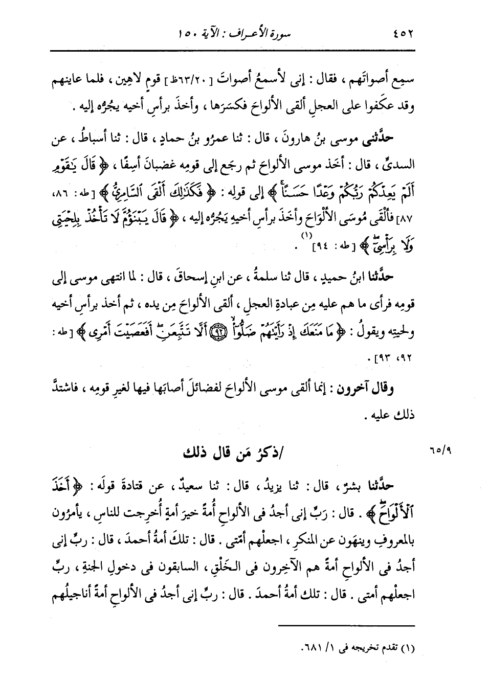 حَدَّثَنَا ابْنُ حُمَيْدٍ، قَالَ: ثنا سَلَمَةُ، عَنِ ابْنِ إِسْحَاقَ، قَالَا: " §لَمَّا انْتَهَى مُوسَى إِلَى قَوْمِهِ فَرَأَى مَا هُمْ عَلَيْهِ مِنْ عِبَادَةِ الْعِجْلِ، أَلْقَى الْأَلْوَاحَ مِنْ يَدِهِ، ثُمَّ أَخَذَ بِرَأْسِ أَخِيهِ وَلِحْيَتِهِ يَقُولُ: {مَا مَنَعَكَ إِذْ رَأَيْتَهُمْ ضَلُّوا أَلَّا تَتَّبِعَنِ أَفَعَصَيْتَ أَمْرِي} [طه: 93] " وَقَالَ آخَرُونَ: إِنَّمَا أَلْقَى مُوسَى الْأَلْوَاحَ لِفَضَائِلَ أَصَابَهَا فِيهَا لِغَيْرِ قَوْمِهِ، فَاشْتَدَّ ذَلِكَ عَلَيْهِ. ذِكْرُ مَنْ قَالَ ذَلِكَ