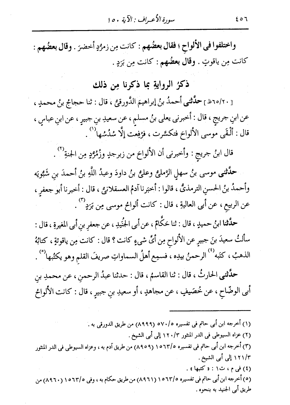 حَدَّثَنِي أَحْمَدُ بْنُ إِبْرَاهِيمَ الدَّوْرَقِيُّ، قَالَ: ثنا حَجَّاجُ بْنُ مُحَمَّدٍ، عَنِ ابْنِ جُرَيْجٍ، قَالَ: أَخْبَرَنِي يَعْلَى بْنُ مُسْلِمٍ، عَنْ سَعِيدِ بْنِ جُبَيْرٍ، عَنِ ابْنِ عَبَّاسٍ، قَالَ: " §أَلْقَى مُوسَى الْأَلْوَاحَ فَتَكَسَّرَتْ، فَرُفِعَتْ إِلَّا سُدُسَهَا. قَالَ ابْنُ جُرَيْجٍ: وَأَخْبَرَنِي أَنَّ الْأَلْوَاحَ مِنْ زَبَرْجَدٍ وَزُمُرُّدٍ مِنَ الْجَنَّةِ "