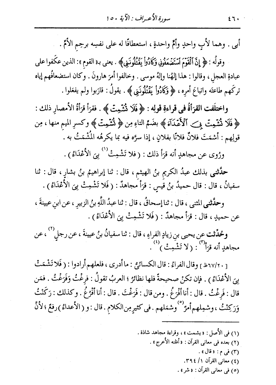 حُدِّثْتُ عَنْ يَحْيَى بْنِ زِيَادٍ الْفَرَّاءِ، قَالَ: ثنا سُفْيَانُ بْنُ عُيَيْنَةَ، عَنْ رَجُلٍ، عَنْ مُجَاهِدٍ أَنَّهُ قَالَ: « (§فَلَا تَشْمَتْ) » وَقَالَ الْفَرَّاءُ: قَالَ الْكِسَائِيُّ: مَا أَدْرِي، فَلَعَلَّهُمْ أَرَادُوا: {فَلَا تُشْمِتْ بِيَ الْأَعْدَاءَ} [الأعراف: 150] فَإِنْ تَكُنْ صَحِيحَةً فَلَهَا نَظَائِرُ. الْعَرَبُ تَقُولُ: فَرِغْتُ وَفَرَغْتُ، فَمَنْ قَالَ: فَرِغْتُ قَالَ: أَنَا أَفْرَغُ، وَمَنْ قَالَ: فَرَغْتَ قَالَ: أَنَا أَفْرُغُ، وَكَذَلِكَ رَكِبْتُ وَرَكَبْتُ وَشَمِلَهُمْ أَمْرٌ وَشَمَلَهُمْ، فِي كَثِيرٍ مِنَ الْكَلَامِ. قَالَ: وَالْأَعْدَاءُ رَفْعٌ؛ لِأَنَّ