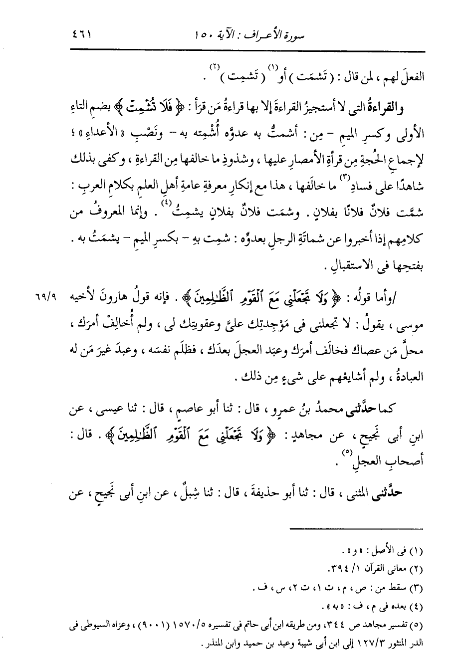 الْفِعْلَ لَهُمْ لِمَنْ قَالَ تَشْمَتْ أَوْ تَشْمُتْ وَالْقِرَاءَةُ الَّتِي لَا أَسْتَجِيزُ الْقِرَاءَةَ إِلَّا بِهَا قِرَاءَةُ مَنْ قَرَأَ: {فَلَا تُشْمِتْ} [الأعراف: 150] بِضَمِّ التَّاءِ الْأُولَى وَكَسْرِ الْمِيمِ مِنْ أَشْمَتُّ بِهِ عَدُوَّهُ أُشَمِّتْهُ بِهِ، وَنَصَبِ الْأَعْدَاءِ لِإِجْمَاعِ الْحُجَّةِ مِنْ قُرَّاءِ الْأَمْصَارِ عَلَيْهَا وَشُذُوذِ مَا خَالَفَهَا مِنَ الْقِرَاءَةِ، وَكَفَى بِذَلِكَ شَاهِدًا عَلَى مَا خَالَفَهَا. هَذَا مَعَ إِنْكَارِ مَعْرِفَةِ عَامَّةِ أَهْلِ الْعِلْمِ بِكَلَامِ الْعَرَبِ: شَمَّتَ فُلَانٌ فُلَانًا بِفُلَانٍ، وَشَمَتَ فُلَانٌ بِفُلَانٍ يَشْمُتُ بِهِ، وَإِنَّمَا الْمَعْرُوفُ مِنْ كَلَامِهِمْ إِذَا أَخْبَرُوا عَنْ شَمَاتَةِ الرَّجُلِ بِعَدُوِّهِ شَمِتَ بِهِ بِكَسْرِ الْمِيمِ يَشْمَتُ بِهِ بِفَتْحِهَا فِي الِاسْتِقْبَالِ