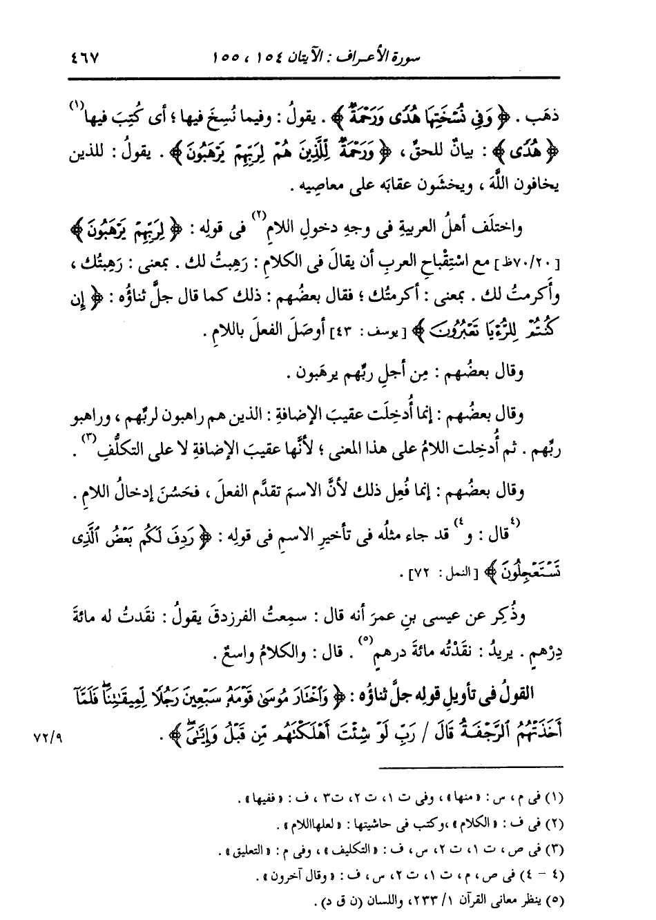 ذَهَبَ. {وَفِي نُسْخَتِهَا هُدًى وَرَحْمَةٌ} [الأعراف: 154] يَقُولُ: وَفِيمَا نُسِخَ فِيهَا: أَيْ: مِنْهَا هُدًى بَيَانٌ لِلْحَقِّ وَرَحْمَةٌ. {لِلَّذِينَ هُمْ لِرَبِّهِمْ يَرْهَبُونَ} [الأعراف: 154] يَقُولُ: لِلَّذِينَ يَخَافُونَ اللَّهَ، وَيَخْشَوْنَ عِقَابَهُ عَلَى مَعَاصِيهِ. وَاخْتَلَفَ أَهْلُ الْعَرَبِيَّةِ فِي وَجْهِ دُخُولِ اللَّامِ فِي قَوْلِهِ: {لِرَبِّهِمْ يَرْهَبُونَ} [الأعراف: 154] مَعَ اسْتِقْبَاحِ الْعَرَبِ أَنْ يُقَالَ فِي الْكَلَامِ: رَهِبْتُ لَكَ: بِمَعْنَى رَهِبْتُكَ، وَأَكْرَمْتُ لَكَ: بِمَعْنَى أَكْرَمْتُكَ، فَقَالَ بَعْضُهُمْ: ذَلِكَ كَمَا قَالَ جَلَّ ثَنَاؤُهُ: {إِنْ كُنْتُمْ لِلرُّؤْيَا تَعْبُرُونَ} [يوسف: 43] أُوصِلَ الْفِعْلُ بِاللَّامِ. وَقَالَ بَعْضُهُمْ: مِنْ أَجْلِ رَبِّهِمْ يَرْهَبُونَ. وَقَالَ بَعْضُهُمْ: إِنَّمَا دَخَلَتْ عَقِبِ الْإِضَافَةِ الَّذِينَ هُمْ رَاهِبُونَ لِرَبِّهِمْ وَرَاهِبُو رَبِّهِمْ ثُمَّ أُدْخِلَتِ اللَّامُ عَلَى هَذَا الْمَعْنَى؛ لِأَنَّهَا عُقَيْبُ الْإِضَافَةِ لَا عَلَى التَّعْلِيقِ. وَقَالَ بَعْضُهُمْ: إِنَّمَا فَعَلَ ذَلِكَ؛ لِأَنَّ الِاسْمَ تَقَدَّمَ الْفِعْلَ، فَحَسُنَ إِدْخَالُ اللَّامِ. وَقَالَ آخَرُونَ: قَدْ جَاءَ مِثْلُهُ فِي تَأْخِيرِ الِاسْمِ فِي قَوْلِهِ: {رَدِفَ لَكُمْ بَعْضُ الَّذِي تَسْتَعْجِلُونَ} [النمل: 72] وَذُكِرَ عَنْ عِيسَى بْنِ عُمَرَ، أَنَّهُ قَالَ: سَمِعْتُ الْفَرَزْدَقَ يَقُولُ: نَقَدْتُ لَهُ مِائَةَ دِرْهَمٍ، يُرِيدُ نَقَدْتُهُ مِائَةَ دِرْهَمٍ. قَالَ: وَالْكَلَامُ وَاسِعٌ