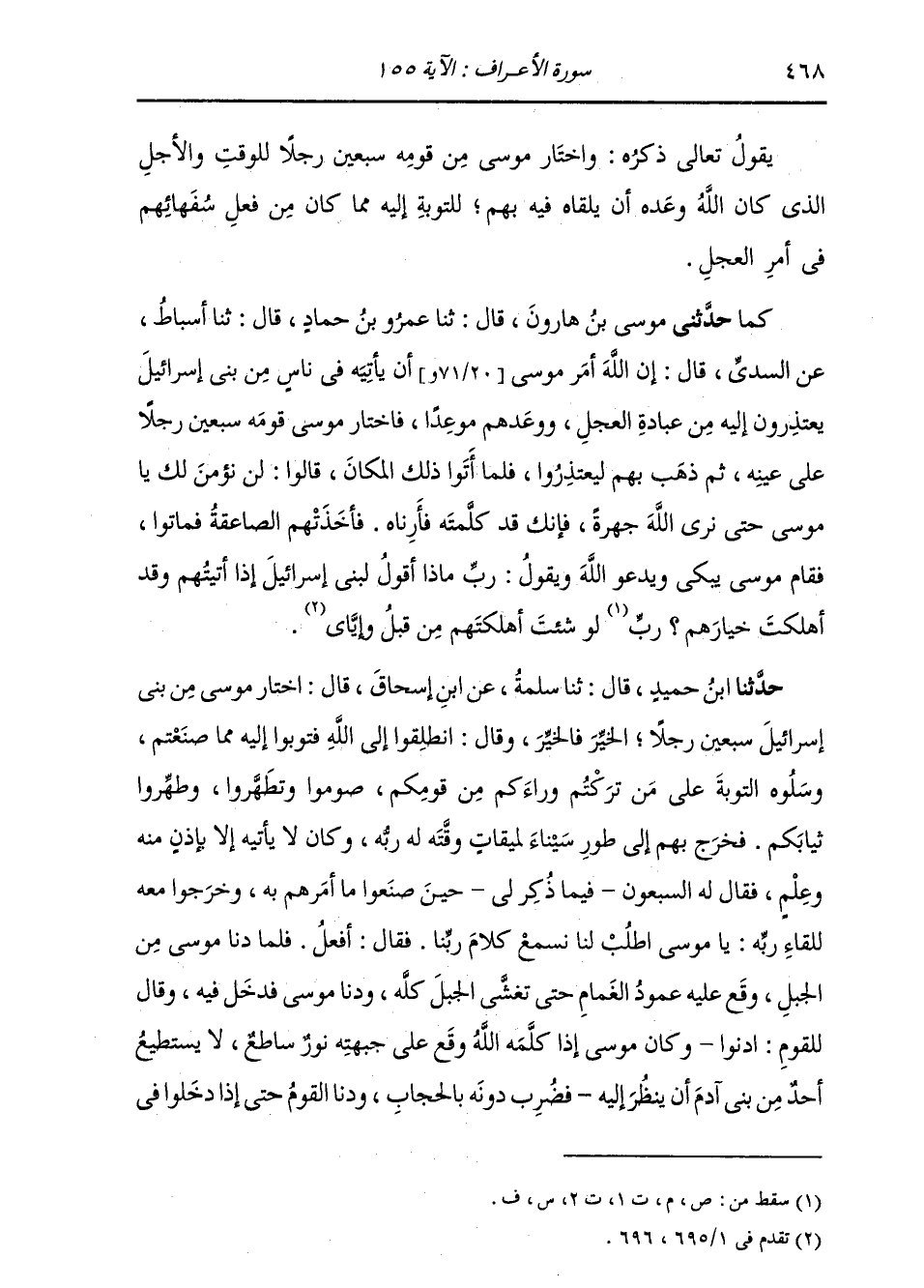 حَدَّثَنَا ابْنُ حُمَيْدٍ، قَالَ: ثنا سَلَمَةُ، عَنِ ابْنِ إِسْحَاقَ، قَالَ: " §اخْتَارَ مُوسَى مِنْ بَنِي إِسْرَائِيلَ سَبْعِينَ رَجُلًا الْخَيِّرَ فَالْخَيِّرَ، وَقَالَ: انْطَلِقُوا إِلَى اللَّهِ فَتُوبُوا إِلَيْهِ مِمَّا صَنَعْتُمْ، وَاسْأَلُوهُ التَّوْبَةَ عَلَى مَنْ تَرَكْتُمْ وَرَاءَكُمْ مِنْ قَوْمِكُمْ، صُومُوا، وَتَطَهَّرُوا، وَطَهِّرُوا ثِيَابَكُمْ، فَخَرَجَ بِهِمْ إِلَى طُورِ سَيْنَا لِمِيقَاتٍ وَقَّتَهُ لَهُ رَبُّهُ، وَكَانَ لَا يَأْتِيهِ إِلَّا بِإِذْنٍ مِنْهُ وَعِلْمٍ، فَقَالَ السَّبْعُونَ فِيمَا ذُكِرَ لِي حِينَ صَنَعُوا مَا أَمَرَهُمْ بِهِ، وَخَرَجُوا مَعَهُ لِلِقَاءِ رَبِّهِ لِمُوسَى: اطْلُبْ لَنَا نَسْمَعُ كَلَامَ رَبِّنَا، فَقَالَ: أَفْعَلُ. فَلَمَّا دَنَا مُوسَى مِنَ الْجَبَلِ، وَقَعَ عَلَيْهِ عَمُودُ الْغَمَامِ حَتَّى تَغَشَّى الْجَبَلَ كُلَّهُ، وَدَنَا مُوسَى فَدَخَلَ فِيهِ، وَقَالَ لِلْقَوْمِ: ادْنُوَا، وَكَانَ مُوسَى إِذَا كَلَّمَهُ اللَّهُ، وَقَعَ عَلَى جَبْهَتِهِ نُورٌ سَاطِعٌ، لَا يَسْتَطِيعُ أَحَدٌ مِنْ بَنِي آدَمَ أَنْ يَنْظُرَ إِلَيْهِ. فَضُرِبَ دُونَهُ بِالْحِجَابِ، وَدَنَا الْقَوْمُ حَتَّى إِذَا دَخَلُوا فِي -[469]- الْغَمَامِ وَقَعُوا سُجُودًا، فَسَمِعُوهُ وَهُوَ يُكَلِّمُ مُوسَى، يَأْمُرُهُ وَيَنْهَاهُ: افْعَلْ، وَلَا تَفْعَلْ، فَلَمَّا فَرَغَ اللَّهُ مِنْ أَمْرِهِ، وَانْكَشَفَ عَنْ مُوسَى الْغَمَامُ، أَقْبَلَ إِلَيْهِمْ، فَقَالُوا لِمُوسَى: {لَنْ نُؤْمِنَ لَكَ حَتَّى نَرَى اللَّهَ جَهْرَةً} [البقرة: 55] {فَأَخَذَتْهُمُ الرَّجْفَةُ} [الأعراف: 78] وَهِيَ الصَّاعِقَةُ، فَالْتَقَتْ أَرْوَاحُهُمْ فَمَاتُوا جَمِيعًا، وَقَامَ مُوسَى عَلَيْهِ السَّلَامُ يُنَاشِدُ رَبَّهُ وَيَدْعُوهُ وَيَرْغَبُ إِلَيْهِ، وَيَقُولُ: رَبِّ لَوْ شِئْتَ أَهْلَكْتَهُمْ مِنْ قَبْلُ وَإِيَّايَ، قَدْ سَفِهُوا، أَفَتَهْلِكُ مَنْ وَرَائِي مِنْ بَنِي إِسْرَائِيلَ "