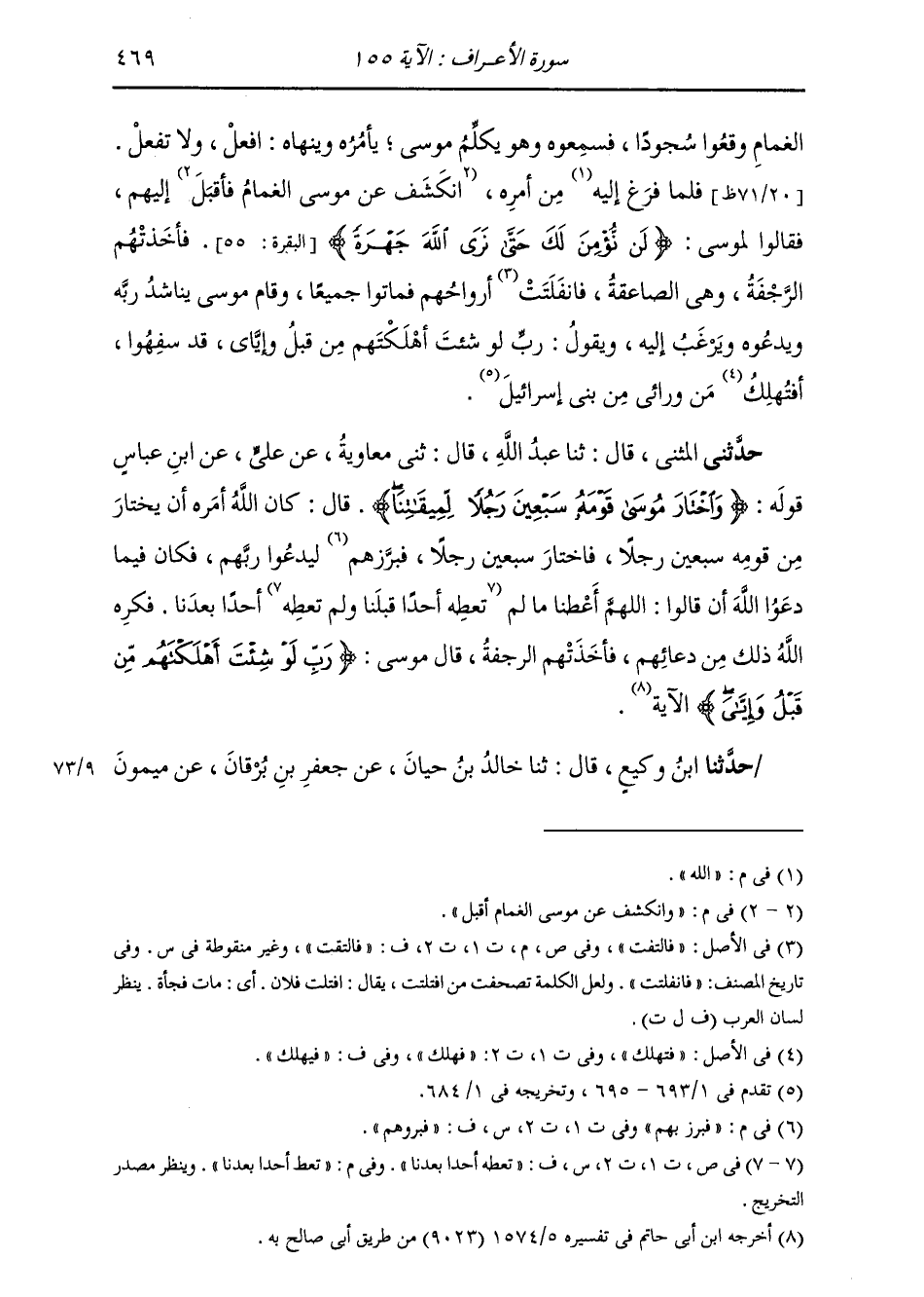 حَدَّثَنِي الْمُثَنَّى، قَالَ: ثنا عَبْدُ اللَّهِ بْنُ صَالِحٍ، قَالَ: ثني مُعَاوِيَةُ، عَنْ عَلِيِّ بْنِ أَبِي طَلْحَةَ، عَنِ ابْنِ عَبَّاسٍ، قَوْلُهُ: " {§وَاخْتَارَ مُوسَى قَوْمَهُ سَبْعِينَ رَجُلًا لِمِيقَاتِنَا} [الأعراف: 155] قَالَ: كَانَ اللَّهُ أَمَرَهُ أَنْ يَخْتَارَ مِنْ قَوْمِهِ سَبْعِينَ رَجُلًا، فَاخْتَارَ سَبْعِينَ رَجُلًا، فَبَرَزَ بِهِمْ لِيَدْعُوا رَبَّهُمْ، فَكَانَ فِيمَا دَعَوُا اللَّهَ أَنْ قَالُوا: اللَّهُمَّ أَعْطِنَا مَا لَمْ تُعْطِ أَحَدًا بَعْدَنَا، فَكَرِهَ اللَّهُ ذَلِكَ مِنْ دُعَائِهِمْ، فَأَخَذَتْهُمُ الرَّجْفَةُ. قَالَ مُوسَى: {رَبِّ لَوْ شِئْتَ أَهْلَكْتَهُمْ مِنْ قَبْلُ وَإِيَّايَ} [الأعراف: 155] "