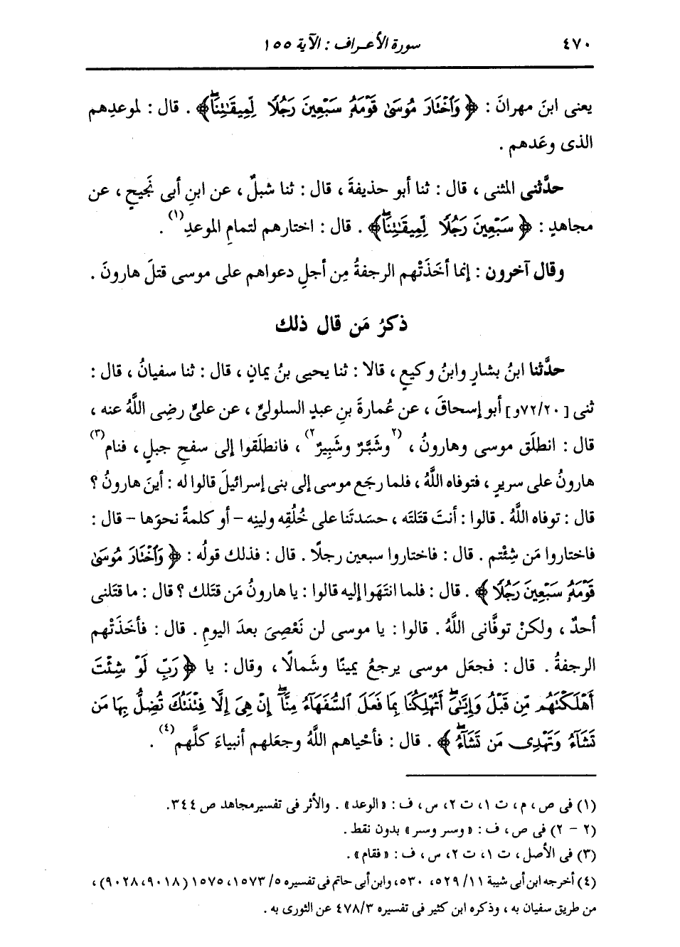 حَدَّثَنِي الْمُثَنَّى، قَالَ: ثنا أَبُو حُذَيْفَةَ، قَالَ: ثنا شِبْلٌ، عَنِ ابْنِ أَبِي نَجِيحٍ، عَنْ مُجَاهِدٍ: " {§سَبْعِينَ رَجُلًا لِمِيقَاتِنَا} [الأعراف: 155] قَالَ: اخْتَارَهُمْ لِتَمَامِ الْوَعْدِ " وَقَالَ آخَرُونَ: إِنَّمَا أَخَذَتْهُمُ الرَّجْفَةُ مِنْ أَجْلِ دَعْوَاهُمْ عَلَى مُوسَى قَتْلَ هَارُونَ. ذِكْرُ مَنْ قَالَ ذَلِكَ