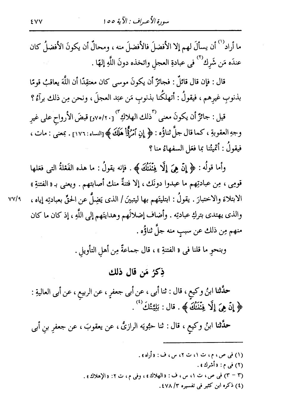 §وَأَمَّا قَوْلُهُ: {إِنْ هِيَ إِلَّا فِتْنَتُكَ} [الأعراف: 155] فَإِنَّهُ يَقُولُ جَلَّ ثَنَاؤُهُ: مَا هَذِهِ الْفِعْلَةُ الَّتِي فَعَلَهَا قَوْمِي مِنْ عِبَادَتِهِمْ مَا عَبَدُوا دُونَكَ، إِلَّا فِتْنَةً مِنْكَ أَصَابَتْهُمْ. وَيَعْنِي بِالْفِتْنَةِ: الِابْتِلَاءَ وَالِاخْتِبَارَ. يَقُولُ: ابْتَلَيْتَهُمْ بِهَا لِيَتَبَيَّنَ الَّذِي يَضِلُّ عَنِ الْحَقِّ بِعِبَادَتِهِ إِيَّاهُ وَالَّذِي يَهْتَدِي بِتَرْكِ عِبَادَتِهِ. وَأَضَافَ إِضْلَالَهُمْ وَهِدَايَتَهُمْ إِلَى اللَّهِ؛ إِذْ كَانَ مَا كَانَ مِنْهُمْ مِنْ ذَلِكَ عَنْ سَبَبٍ مِنْهُ جَلَّ ثَنَاؤُهُ. وَبِنَحْوِ مَا قُلْنَا فِي الْفِتْنَةِ قَالَ جَمَاعَةٌ مِنْ أَهْلِ التَّأْوِيلِ. ذِكْرُ مَنْ قَالَ ذَلِكَ
