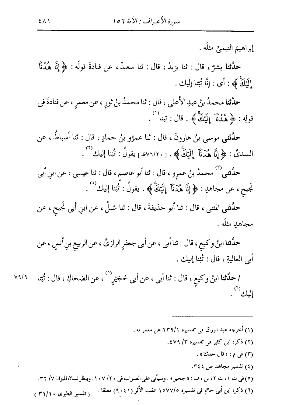 قَالَ: حَدَّثَنَا مُحَمَّدُ بْنُ عَمْرٍو، قَالَ: ثنا أَبُو عَاصِمٍ، قَالَ: ثنا عِيسَى، عَنِ ابْنِ أَبِي نَجِيحٍ، عَنْ مُجَاهِدٍ: " {§إِنَّا هُدْنَا إِلَيْكَ} [الأعراف: 156] يَقُولُ: تُبْنَا إِلَيْكَ " حَدَّثَنِي الْمُثَنَّى، قَالَ: ثنا أَبُو حُذَيْفَةَ، قَالَ: ثنا شِبْلٌ، عَنِ ابْنِ أَبِي نَجِيحٍ، عَنْ مُجَاهِدٍ، مِثْلَهُ