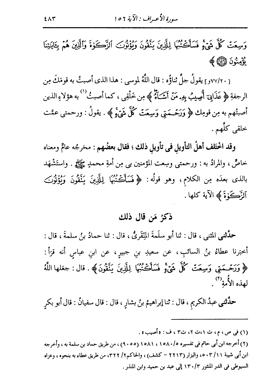 حَدَّثَنِي الْمُثَنَّى، قَالَ: ثنا أَبُو سَلَمَةَ الْمِنْقَرِيُّ، قَالَ: ثنا حَمَّادُ بْنُ سَلَمَةَ، قَالَ: أَخْبَرَنَا عَطَاءُ بْنُ السَّائِبِ، عَنْ سَعِيدِ بْنِ جُبَيْرٍ، عَنِ ابْنِ عَبَّاسٍ، أَنَّهُ قَرَأَ: " {§وَرَحْمَتِي وَسِعَتْ كُلَّ شَيْءٍ فَسَأَكْتُبُهَا لِلَّذِينَ يَتَّقُونَ} [الأعراف: 156] قَالَ: جَعَلَهَا اللَّهُ لِهَذِهِ الْأُمَّةِ "
