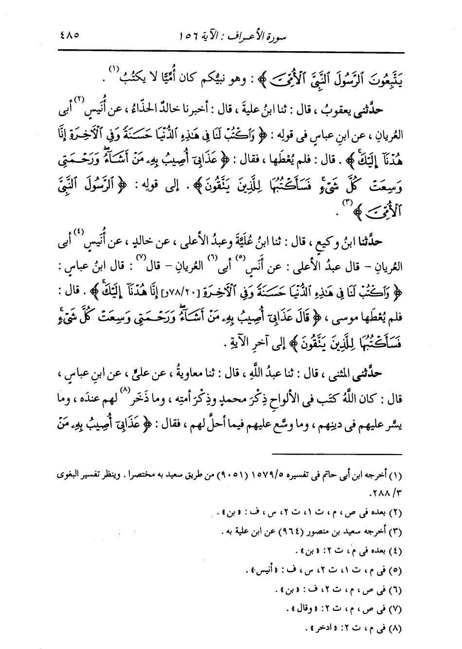 حَدَّثَنِي يَعْقُوبُ، قَالَ: ثنا ابْنُ عُلَيَّةَ، قَالَ: أَخْبَرَنَا خَالِدٌ الْحَذَّاءُ، عَنْ أُنَيْسِ بْنِ أَبِي الْعُرْيَانِ، عَنِ ابْنِ عَبَّاسٍ، فِي قَوْلِهِ: " {§وَاكْتُبْ لَنَا فِي هَذِهِ الدُّنْيَا حَسَنَةً وَفِي الْآخِرَةِ إِنَّا هُدْنَا إِلَيْكَ} [الأعراف: 156] قَالَ: فَلَمْ يُعْطَهَا، فَقَالَ: {عَذَابِي أُصِيبُ بِهِ مَنْ أَشَاءُ وَرَحْمَتِي وَسِعَتْ كُلَّ شَيْءٍ فَسَأَكْتُبُهَا لِلَّذِينَ يَتَّقُونَ} [الأعراف: 156] إِلَى قَوْلِهِ: {الرَّسُولَ النَّبِيَّ الْأُمِّيَّ} [الأعراف: 157] "