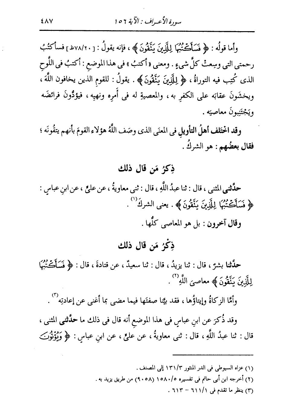 حَدَّثَنِي الْمُثَنَّى، قَالَ: ثنا عَبْدُ اللَّهِ بْنُ صَالِحٍ، قَالَ: ثني مُعَاوِيَةُ، عَنْ عَلِيٍّ، عَنِ ابْنِ عَبَّاسٍ: " {§فَسَأَكْتُبُهَا لِلَّذِينَ يَتَّقُونَ} [الأعراف: 156] يَعْنِي الشِّرْكَ " وَقَالَ آخَرُونَ: بَلْ هُوَ الْمَعَاصِي كُلُّهَا. ذِكْرُ مَنْ قَالَ ذَلِكَ