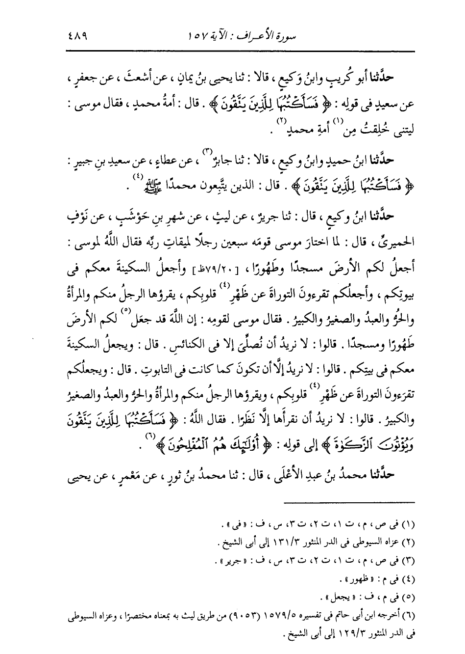 حَدَّثَنَا أَبُو كُرَيْبٍ، وَابْنُ وَكِيعٍ، قَالَا: ثنا يَحْيَى بْنُ يَمَانٍ، عَنْ أَشْعَثَ، عَنْ جَعْفَرٍ، عَنْ سَعِيدٍ، فِي قَوْلِهِ: " {§فَسَأَكْتُبُهَا لِلَّذِينَ يَتَّقُونَ} [الأعراف: 156] قَالَ: أُمَّةُ مُحَمَّدٍ صَلَّى اللهُ عَلَيْهِ وَسَلَّمَ، فَقَالَ مُوسَى عَلَيْهِ السَّلَامُ: لَيْتَنِي خُلِقْتُ فِي أُمَّةِ مُحَمَّدٍ "