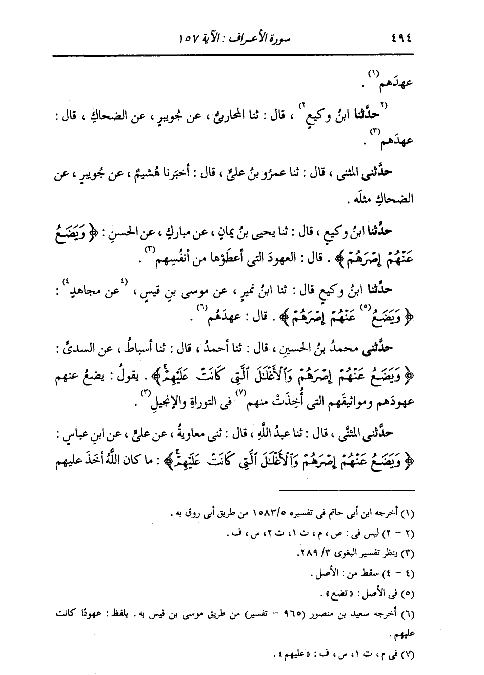 قَالَ: ثنا ابْنُ نُمَيْرٍ، عَنْ مُوسَى بْنِ قَيْسٍ، عَنْ مُجَاهِدٍ: " {§وَيَضَعُ عَنْهُمْ إِصْرَهُمْ} [الأعراف: 157] قَالَ: عَهْدَهُمْ "