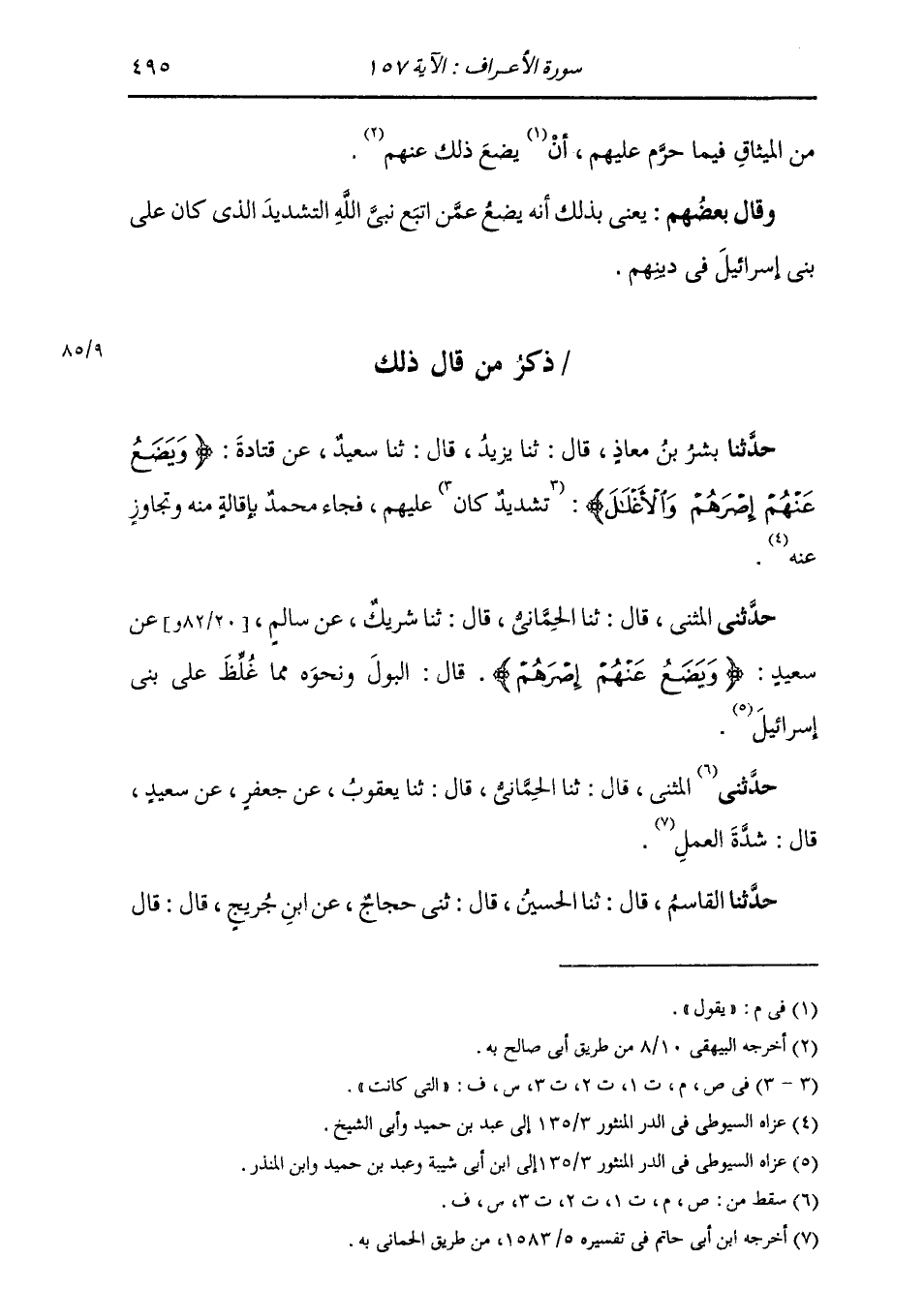 حَدَّثَنِي الْمُثَنَّى، قَالَ: ثنا الْحِمَّانِيُّ، قَالَ: ثنا شَرِيكٌ، عَنْ سَالِمٍ، عَنْ سَعِيدٍ: " {§وَيَضَعُ عَنْهُمْ إِصْرَهُمْ} [الأعراف: 157] قَالَ: الْبَوْلَ وَنَحْوَهُ مِمَّا غُلِّظَ عَلَى بَنِي إِسْرَائِيلَ "