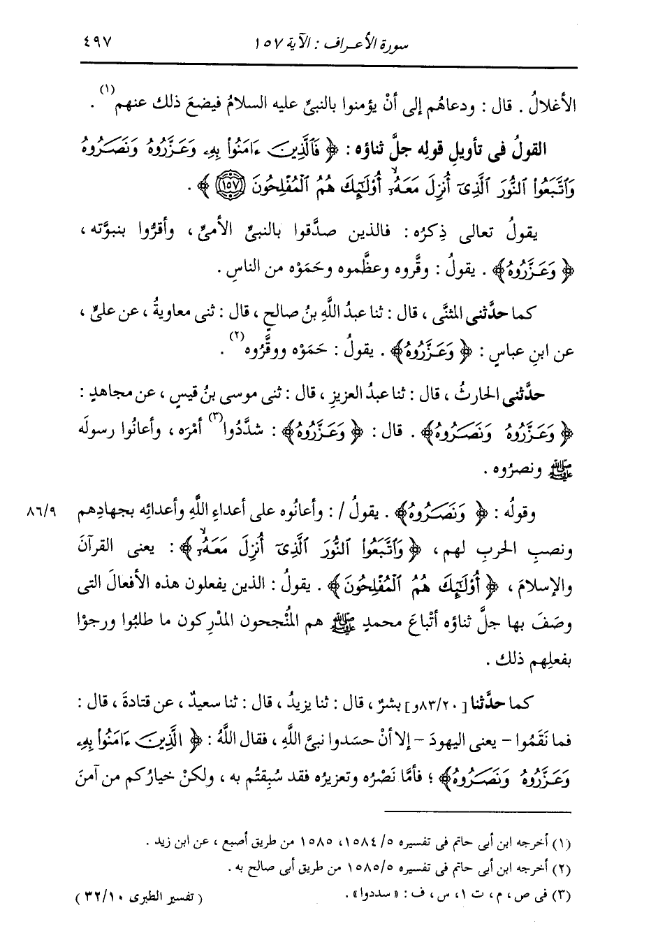 §الْقَوْلُ فِي تَأْوِيلِ قَوْلِهِ تَعَالَى: {فَالَّذِينَ آمَنُوا بِهِ وَعَزَّرُوهُ وَنَصَرُوهُ وَاتَّبَعُوا النُّورَ الَّذِي أُنْزِلَ مَعَهُ أُولَئِكَ هُمُ الْمُفْلِحُونَ} [الأعراف: 157] يَقُولُ تَعَالَى ذِكْرُهُ: فَالَّذِينَ صَدَّقُوا بِالنَّبِيِّ الْأُمِّيِّ، وَأَقَرُّوا بِنُبُوَّتِهِ، {وَعَزَّرُوهُ} [الأعراف: 157] يَقُولُ: وَقَّرُوهُ وَعَظَّمُوهُ وَحَمَوْهُ مِنَ النَّاسِ