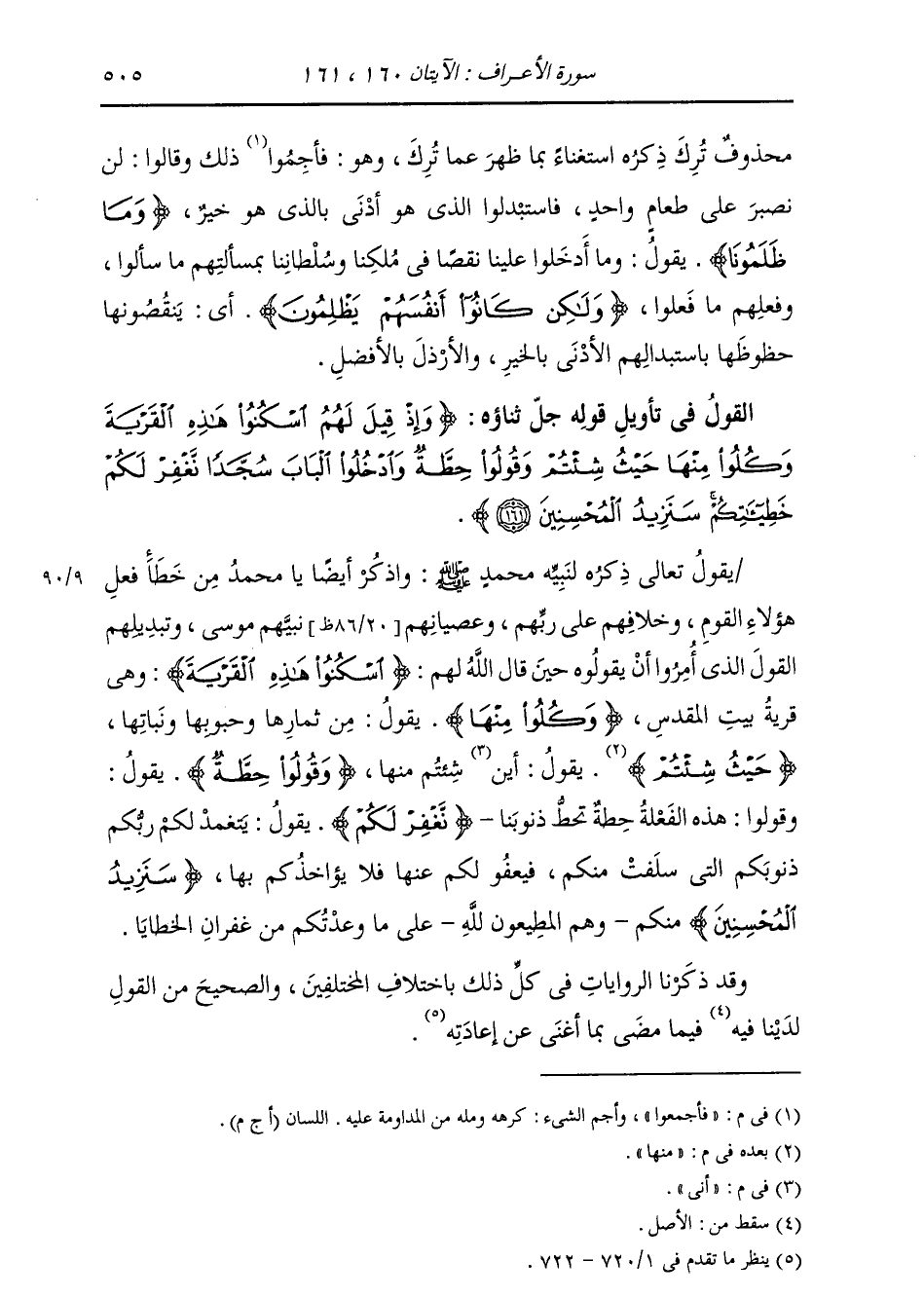 §الْقَوْلُ فِي تَأْوِيلِ قَوْلِهِ تَعَالَى: {وَإِذْ قِيلَ لَهُمُ اسْكُنُوا هَذِهِ الْقَرْيَةَ وَكُلُوا مِنْهَا حَيْثُ شِئْتُمْ وَقُولُوا حِطَّةٌ وَادْخُلُوا الْبَابَ سُجَّدًا نَغْفِرْ لَكُمْ خَطَايَاكُمْ سَنَزِيدُ الْمُحْسِنِينَ} يَقُولُ تَعَالَى ذِكْرُهُ لِنَبِيِّهِ مُحَمَّدٍ صَلَّى اللهُ عَلَيْهِ وَسَلَّمَ: وَاذْكُرْ أَيْضًا يَا مُحَمَّدُ مِنْ خَطَإِ فِعْلِ هَؤُلَاءِ الْقَوْمِ وَخِلَافِهِمْ عَلَى رَبِّهِمْ وَعِصْيَانِهِمْ نَبِيَّهُمْ مُوسَى عَلَيْهِ السَّلَامُ وَتَبْدِيلِهِمُ الْقَوْلَ الَّذِي أُمِرُوا أَنْ يَقُولُوهُ حِينَ قَالَ اللَّهُ لَهُمْ: {اسْكُنُوا هَذِهِ الْقَرْيَةَ} [الأعراف: 161] وَهِيَ قَرْيَةُ بَيْتِ الْمَقْدِسِ، {وَكُلُوا مِنْهَا} [الأعراف: 161] يَقُولُ: مِنْ ثِمَارِهَا وَحُبُوبِهَا وَنَبَاتِهَا، {حَيْثُ شِئْتُمْ} [البقرة: 58] مِنْهَا يَقُولُ: أَنَّى شِئْتُمْ مِنْهَا، {وَقُولُوا حِطَّةٌ} [البقرة: 58] يَقُولُ: وَقُولُوا هَذِهِ الْفِعْلَةَ حِطَّةٌ تَحُطُّ ذُنُوبَنَا، {نَغْفِرْ لَكُمْ} [البقرة: 58] يَتَغَمَّدُ لَكُمْ رَبُّكُمْ ذُنُوبَكُمُ الَّتِي سَلَفَتْ مِنْكُمْ، فَيَعْفُو لَكُمْ عَنْهَا، فَلَا يُؤَاخِذُكُمْ بِهَا. {سَنَزِيدُ الْمُحْسِنِينَ} [الأعراف: 161] مِنْكُمْ، وَهُمُ الْمُطِيعُونَ لِلَّهِ، عَلَى مَا وَعَدْتُكُمْ مِنْ غُفْرَانِ الْخَطَايَا. وَقَدْ ذَكَرْنَا الرِّوَايَاتِ فِي كُلِّ ذَلِكَ بِاخْتِلَافِ الْمُخْتَلِفِينَ وَالصَّحِيحَ مِنَ الْقَوْلِ لَدَيْنَا فِيهِ فِيمَا مَضَى بِمَا أَغْنَى عَنْ إِعَادَتِهِ