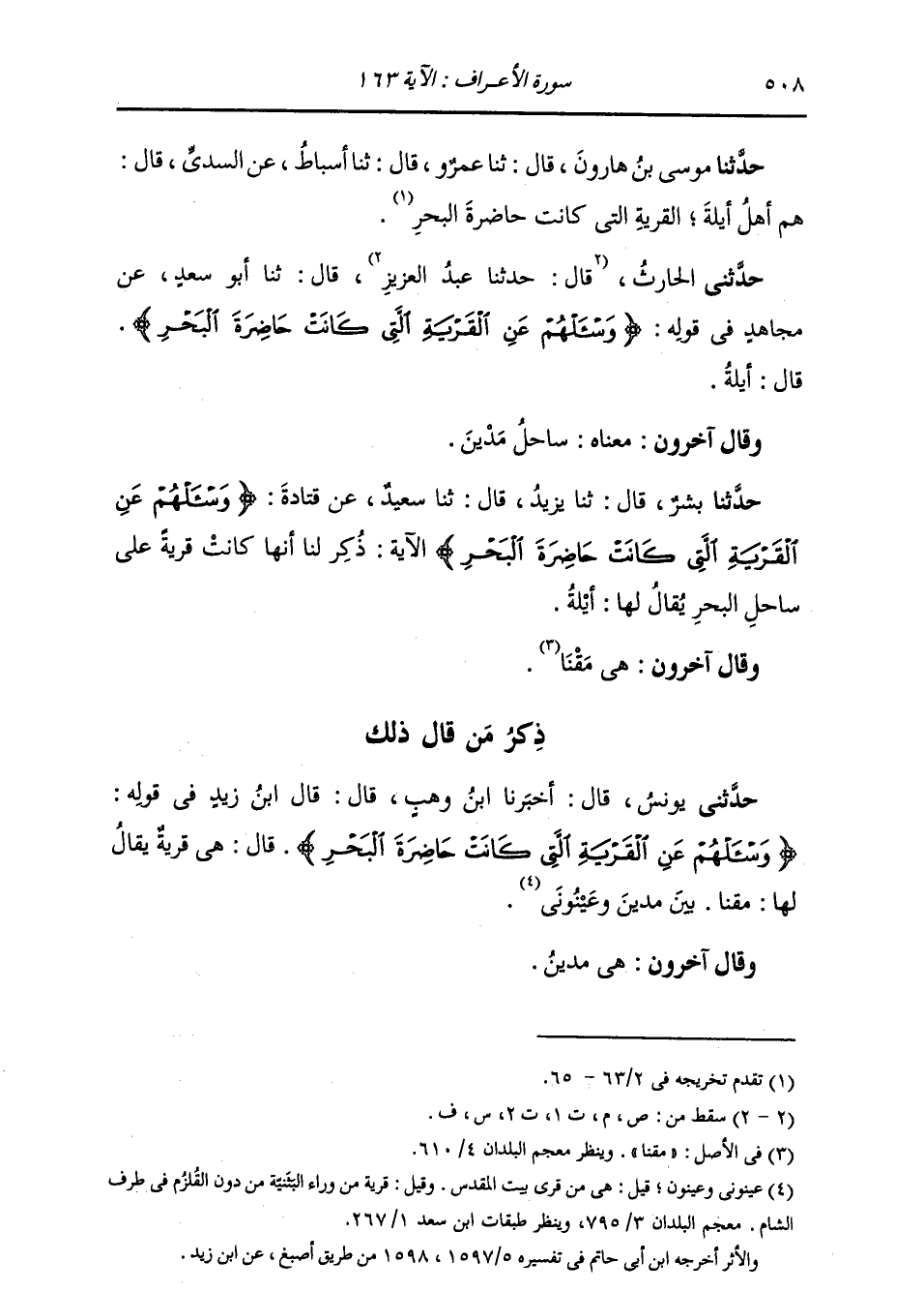 حَدَّثَنَا مُوسَى بْنُ هَارُونَ، قَالَ: ثنا عَمْرٌو، قَالَ: ثنا أَسْبَاطٌ، عَنِ السُّدِّيِّ، قَالَ: «§هُمْ أَهْلُ أَيْلَةَ، الْقَرْيَةُ الَّتِي كَانَتْ حَاضِرَةَ الْبَحْرِ»
