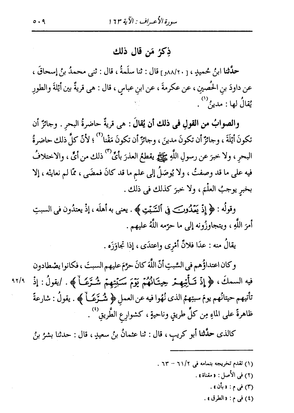 ذِكْرُ مَنْ قَالَ ذَلِكَ: حَدَّثَنَا ابْنُ حُمَيْدٍ، قَالَ: ثنا سَلَمَةُ، قَالَ: ثني مُحَمَّدُ بْنُ إِسْحَاقَ، عَنْ دَاوُدَ بْنِ الْحُصَيْنِ، عَنْ عِكْرِمَةَ، عَنِ ابْنِ عَبَّاسٍ، قَالَ: «§هِيَ قَرْيَةٌ بَيْنَ أَيْلَةَ وَالطُّورِ يُقَالُ لَهَا مَدْيَنُ» وَالصَّوَابُ مِنَ الْقَوْلِ فِي ذَلِكَ أَنْ يُقَالَ: هِيَ قَرْيَةٌ حَاضِرَةُ الْبَحْرِ، وَجَائِزٌ أَنْ تَكُونَ أَيْلَةَ، وَجَائِزٌ أَنْ تَكُونَ مَدْيَنَ، وَجَائِزٌ أَنْ تَكُونَ مقنا؛ لِأَنَّ كُلَّ ذَلِكَ حَاضِرَةُ الْبَحْرِ. وَلَا خَبَرَ عَنْ رَسُولِ اللَّهِ صَلَّى اللهُ عَلَيْهِ وَسَلَّمَ يَقْطَعُ الْعُذْرَ بِأَنَّ ذَلِكَ مِنْ أَيٍّ، وَالِاخْتِلَافُ فِيهِ عَلَى مَا وَصَفْتُ، وَلَا يُوصَلُ إِلَى عِلْمِ مَا قَدْ كَانَ فَمَضَى مِمَّا لَمْ نُعَايِنْهُ، إِلَّا بِخَبَرٍ يُوجِبُ الْعِلْمَ وَلَا خَبَرَ كَذَلِكَ فِي ذَلِكَ. وَقَوْلُهُ: {إِذْ يَعْدُونَ فِي السَّبْتِ} [الأعراف: 163] يَعْنِي بِهِ أَهْلَهُ: إِذْ يَعْتَدُونَ فِي السَّبْتِ أَمْرَ اللَّهِ، وَيَتَجَاوَزُونَهُ إِلَى مَا حَرَّمَهُ اللَّهُ عَلَيْهِمْ، يُقَالُ مِنْهُ: عَدَا فُلَانٌ أَمْرِي وَاعْتَدَى: إِذَا تُجَاوِزَهُ. وَكَانَ اعْتِدَاؤُهُمْ فِي السَّبْتِ أَنَّ اللَّهَ كَانَ حَرَّمَ عَلَيْهِمُ السَّبْتَ، فَكَانُوا يَصْطَادُونَ فِيهِ السَّمَكَ {إِذْ تَأْتِيهِمْ حِيتَانُهُمْ يَوْمَ سَبْتِهِمْ شُرَّعًا} [الأعراف: 163] يَقُولُ: إِذْ تَأْتِيهِمْ حِيتَانُهُمْ يَوْمَ سَبْتِهِمُ الَّذِي نُهُوا فِيهِ عَنِ الْعَمَلِ شُرَّعًا، يَقُولُ: شَارِعَةٌ ظَاهِرَةٌ عَلَى الْمَاءِ مِنْ كُلِّ طَرِيقٍ وَنَاحِيَةٍ كَشَوَارِعِ الطُّرُقِ