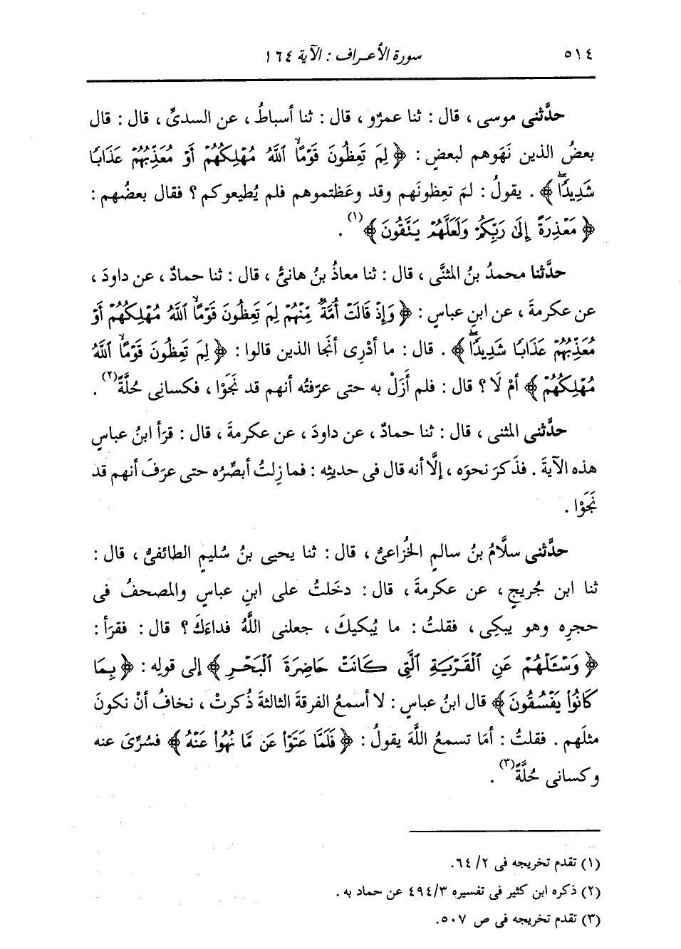 حَدَّثَنَا مُحَمَّدُ بْنُ الْمُثَنَّى، قَالَ: ثنا مُعَاذُ بْنُ هَانِئٍ، قَالَ: ثنا حَمَّادٌ، عَنْ دَاوُدَ، عَنْ عِكْرِمَةَ، عَنِ ابْنِ عَبَّاسٍ: " {§وَإِذْ قَالَتْ أُمَّةٌ مِنْهُمْ لِمَ تَعِظُونَ قَوْمًا اللَّهُ مُهْلِكُهُمْ أَوْ مُعَذِّبُهُمْ عَذَابًا شَدِيدًا} [الأعراف: 164] قَالَ: مَا أَدْرِي أَنَجَا الَّذِينَ قَالُوا: {لِمَ تَعِظُونَ قَوْمًا اللَّهُ مُهْلِكُهُمْ} [الأعراف: 164] أَمْ لَا؟ قَالَ: فَلَمْ أَزَلْ بِهِ حَتَّى عَرَّفْتُهُ أَنَّهُمْ قَدْ نَجَوْا، فَكَسَانِي حُلَّةً " حَدَّثَنِي الْمُثَنَّى، قَالَ: ثنا حَمَّادٌ، عَنْ دَاوُدَ، عَنْ عِكْرِمَةَ، قَالَ: قَرَأَ ابْنُ عَبَّاسٍ هَذِهِ الْآيَةَ، فَذَكَرَ نَحْوَهُ، إِلَّا أَنَّهُ قَالَ فِي حَدِيثِهِ: فَمَا زِلْتُ أَبْصُرُهُ حَتَّى عَرَفَ أَنَّهُمْ قَدْ نَجَوْا