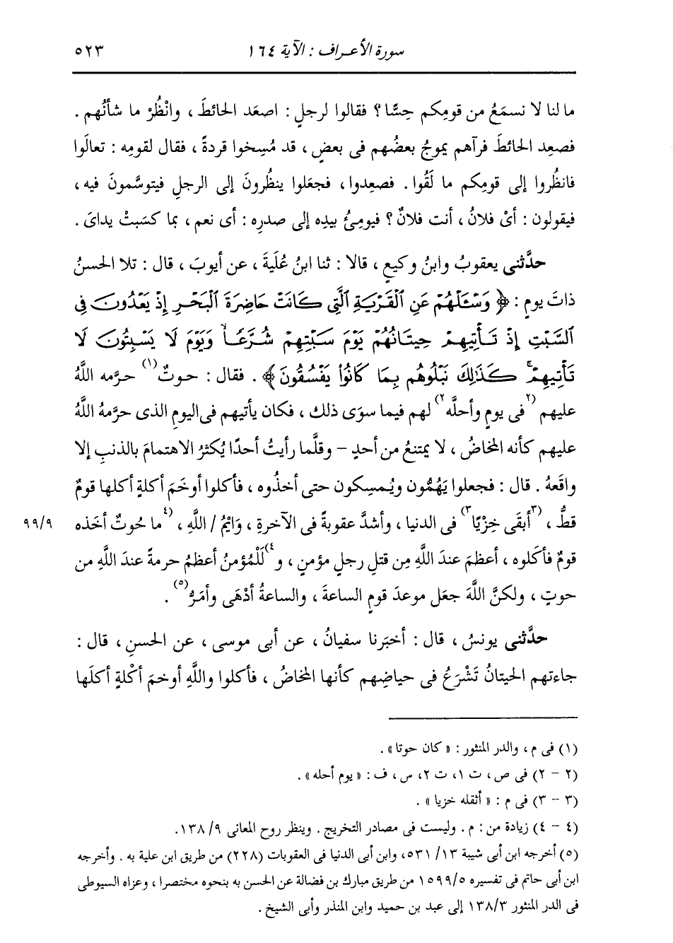 حَدَّثَنِي يُونُسُ، قَالَ: أَخْبَرَنَا سُفْيَانُ، عَنْ أَبِي مُوسَى، عَنِ الْحَسَنِ، قَالَ: " §جَاءَتْهُمُ الْحِيتَانُ تَشْرَعُ فِي حِيَاضِهِمْ كَأَنَّهَا الْمَخَاضُ، فَأَكَلُوا وَاللَّهِ أَوْخَمَ أَكْلَةً أَكْلَهَا -[524]- قَوْمٌ قَطُّ، أَسْوَؤُهُ عُقُوبَةً فِي الدُّنْيَا وَأَشَدُّهُ عَذَابًا فِي الْآخِرَةِ. وَقَالَ الْحَسَنُ: وَقَتْلُ الْمُؤْمِنِ وَاللَّهِ أَعْظَمُ مِنْ أَكَلِ الْحِيتَانِ "
