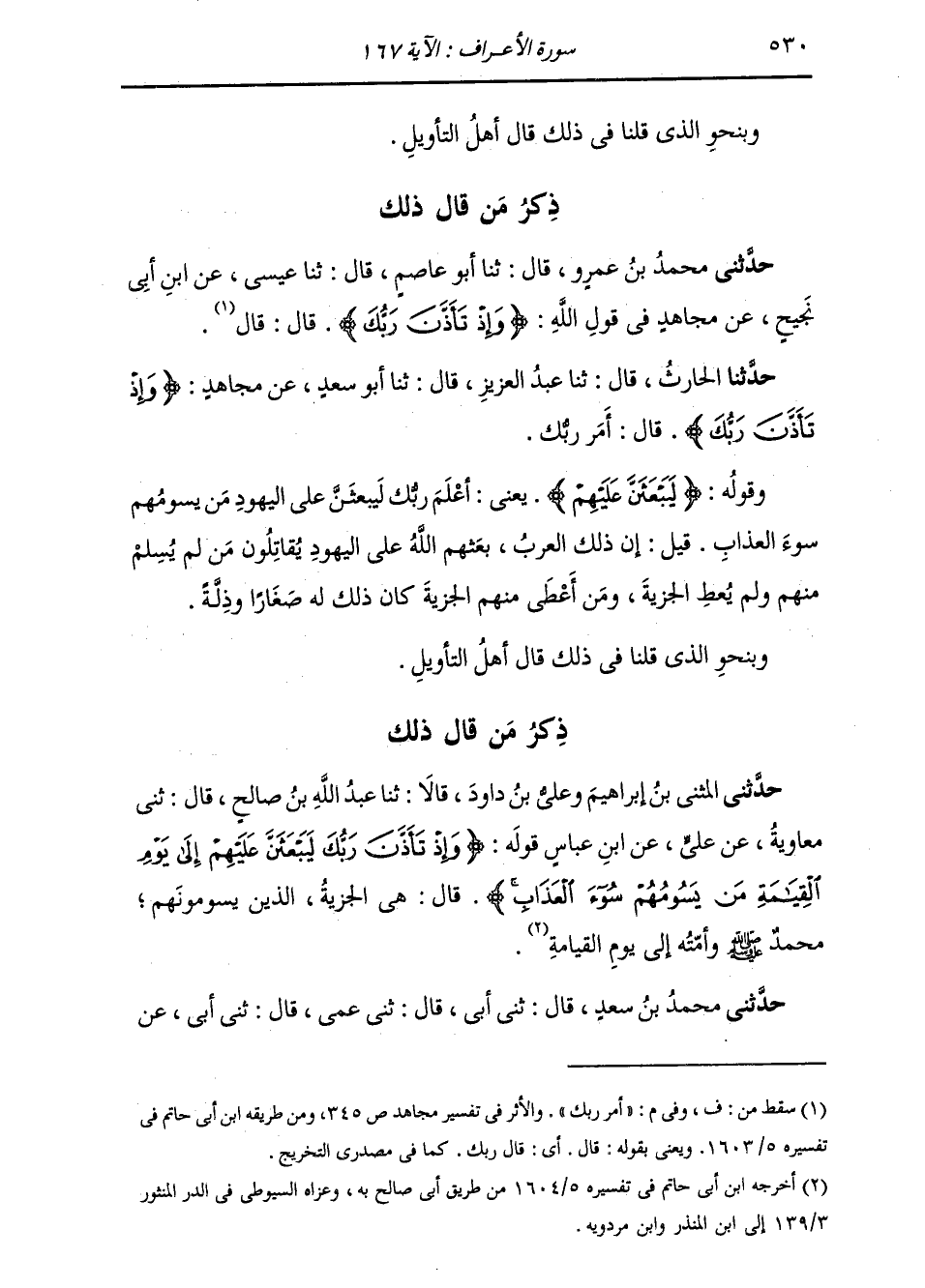 ذِكْرُ مَنْ قَالَ ذَلِكَ: حَدَّثَنِي الْمُثَنَّى بْنُ إِبْرَاهِيمَ، وَعَلِيُّ بْنُ دَاوُدَ، قَالَا: ثنا عَبْدُ اللَّهِ بْنُ صَالِحٍ، قَالَ: ثني مُعَاوِيَةُ، عَنْ عَلِيٍّ، عَنِ ابْنِ عَبَّاسٍ، قَوْلُهُ: " {§وَإِذْ تَأَذَّنَّ رَبُّكَ لَيَبْعَثَنَّ عَلَيْهِمْ إِلَى يَوْمِ الْقِيَامَةِ مَنْ يَسُومُهُمْ سُوءَ الْعَذَابِ} [الأعراف: 167] قَالَ: هِيَ الْجِزْيَةُ، وَالَّذِينَ يَسُومُونَهُمْ: مُحَمَّدٌ صَلَّى اللهُ عَلَيْهِ وَسَلَّمَ وَأُمَّتُهُ إِلَى يَوْمِ الْقِيَامَةِ "