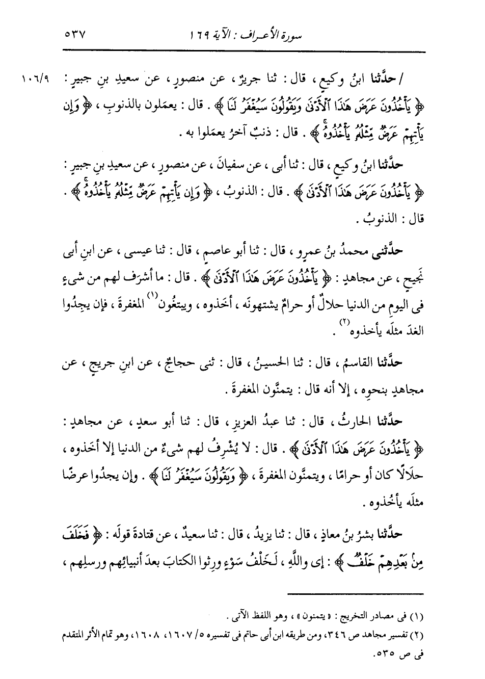 حَدَّثَنَا ابْنُ وَكِيعٍ، قَالَ: ثنا أَبِي، عَنْ سُفْيَانَ، عَنْ مَنْصُورٍ، عَنْ سَعِيدِ بْنِ جُبَيْرٍ: " {§يَأْخُذُونَ عَرَضَ هَذَا الْأَدْنَى} [الأعراف: 169] قَالَ: الذُّنُوبُ. {وَإِنْ يَأْتِهِمْ عَرَضٌ مِثْلُهُ يَأْخُذُوهُ} [الأعراف: 169] قَالَ: الذُّنُوبُ "