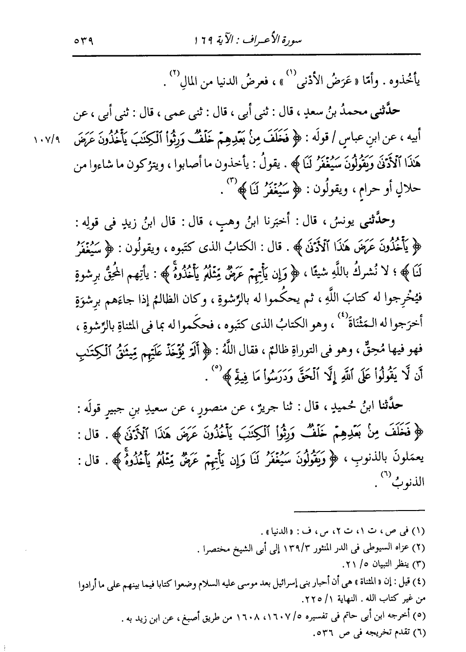 حَدَّثَنَا ابْنُ حُمَيْدٍ، قَالَ: ثنا جَرِيرٌ، عَنْ مَنْصُورٍ، عَنْ سَعِيدِ بْنِ جُبَيْرٍ، قَوْلُهُ: " {§فَخَلَفَ مِنْ بَعْدِهِمْ خَلْفٌ وَرِثُوا الْكِتَابَ يَأْخُذُونَ عَرَضَ هَذَا الْأَدْنَى} [الأعراف: 169] قَالَ: يَعْمَلُونَ الذُّنُوبَ "