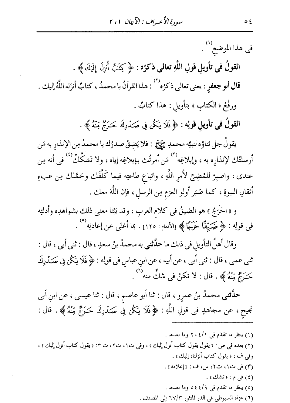 §الْقَوْلُ فِي تَأْوِيلِ قَوْلِهِ تَعَالَى: {كِتَابٌ أُنْزِلَ إِلَيْكَ فَلَا يَكُنْ فِي صَدْرِكَ حَرَجٌ مِنْهُ لِتُنْذِرَ بِهِ وَذِكْرَى لِلْمُؤْمِنِينَ} [الأعراف: 2] قَالَ أَبُو جَعْفَرٍ: يَعْنِي تَعَالَى ذِكْرُهُ: هَذَا الْقُرْآنُ يَا مُحَمَّدُ فِي كِتَابٍ أَنْزَلَهُ اللَّهُ إِلَيْكَ. وَرَفَعَ (الْكِتَابَ) بِتَأْوِيلِ: هَذَا كِتَابٌ