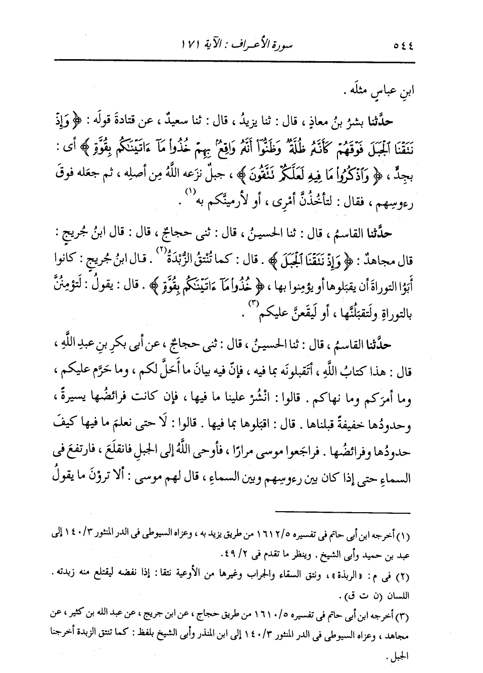 حَدَّثَنَا الْقَاسِمُ، قَالَ: ثنا الْحُسَيْنُ، قَالَ: ثني حَجَّاجٌ، قَالَ: قَالَ ابْنُ جُرَيْجٍ، قَالَ مُجَاهِدٌ: " {§وَإِذْ نَتَقْنَا الْجَبَلَ} [الأعراف: 171] قَالَ: كَمَا تُنْتَقُ الزَّبْدَةُ "