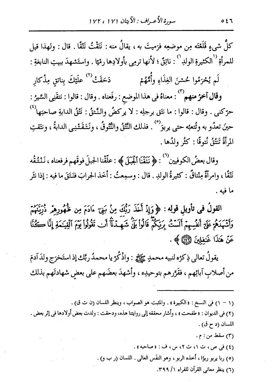 §الْقَوْلُ فِي تَأْوِيلِ قَوْلِهِ تَعَالَى: {وَإِذْ أَخَذَ رَبُّكَ مِنْ بَنِي آدَمَ مِنْ ظُهُورِهِمْ ذُرِّيَّتَهُمْ وَأَشْهَدَهُمْ عَلَى أَنْفُسِهِمْ أَلَسْتُ بِرَبِّكُمْ قَالُوا بَلَى شَهِدْنَا أَنْ تَقُولُوا يَوْمَ الْقِيَامَةِ إِنَّا كُنَّا عَنْ هَذَا غَافِلِينَ} [الأعراف: 172] يَقُولُ تَعَالَى ذِكْرُهُ لِنَبِيِّهِ مُحَمَّدٍ صَلَّى اللهُ عَلَيْهِ وَسَلَّمَ: وَاذْكُرْ يَا مُحَمَّدُ رَبَّكَ إِذِ اسْتَخْرَجَ وَلَدَ آدَمَ مِنْ أَصْلَابِ آبَائِهِمْ، فَقَرَّرَهُمْ بِتَوْحِيدِهِ، وَأَشْهَدَ بَعْضَهُمْ عَلَى بَعْضٍ شَهَادَتَهُمْ بِذَلِكَ، -[547]- وَإِقْرَارَهُمْ بِهِ