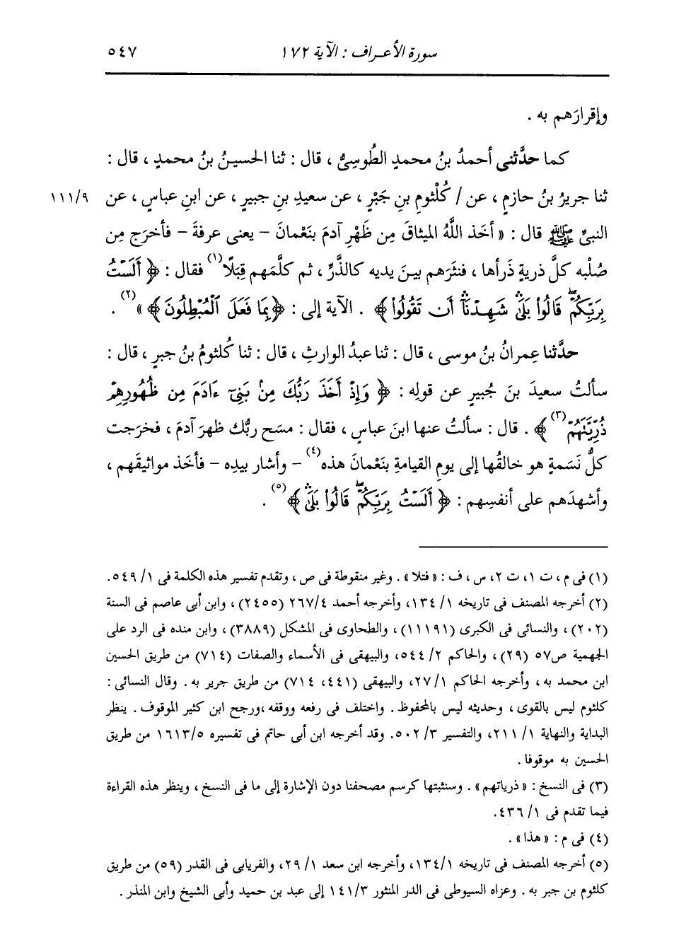 كَمَا: حَدَّثَنِي أَحْمَدُ بْنُ مُحَمَّدٍ الطُّوسِيُّ، قَالَ: ثنا الْحُسَيْنُ بْنُ مُحَمَّدٍ، قَالَ: ثنا جَرِيرُ بْنُ حَازِمٍ، عَنْ كُلْثُومِ بْنِ جَبْرٍ، عَنْ سَعِيدِ بْنِ جُبَيْرٍ، عَنِ ابْنِ عَبَّاسٍ، عَنِ النَّبِيِّ صَلَّى اللهُ عَلَيْهِ وَسَلَّمَ، قَالَ: " §أَخَذَ اللَّهُ الْمِيثَاقَ مِنْ ظَهْرِ آدَمَ بِنَعْمَانَ يَعْنِي عَرَفَةَ فَأَخْرَجَ مِنْ صُلْبِهِ كُلَّ ذُرِّيَّةٍ ذَرَأَهَا، فَنَثَرَهُمْ بَيْنَ يَدَيْهِ كَالذَّرِّ، ثُمَّ كَلَّمَهُمْ فَتَلَا فَقَالَ: {أَلَسْتُ بِرَبِّكُمْ قَالُوا بَلَى شَهِدْنَا أَنْ تَقُولُوا} [الأعراف: 172] الْآيَةَ إِلَى {مَا فَعَلَ الْمُبْطِلُونَ} "