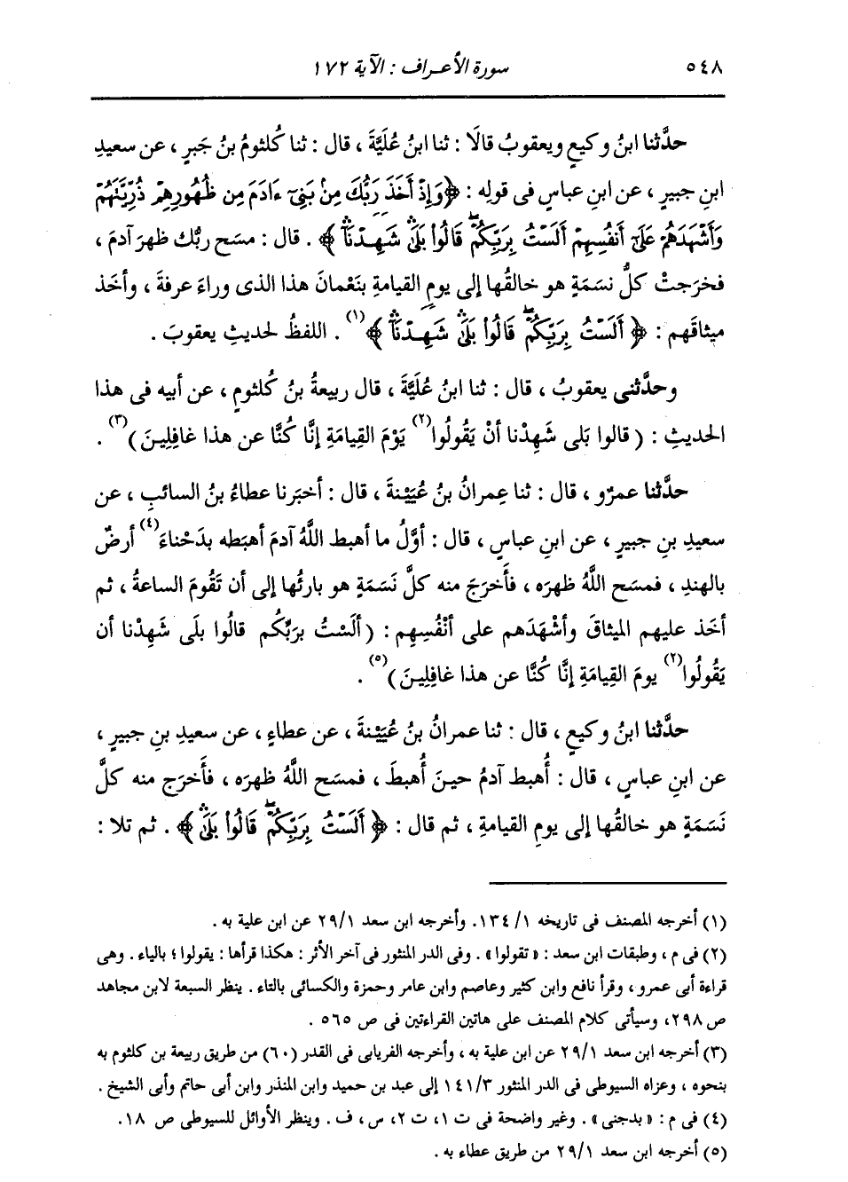 حَدَّثَنَا ابْنُ وَكِيعٍ وَيَعْقُوبُ قَالَا: ثنا ابْنُ عُلَيَّةَ، قَالَ: ثنا كُلْثُومُ بْنُ جَبْرٍ، عَنْ سَعِيدِ بْنِ جُبَيْرٍ، عَنِ ابْنِ عَبَّاسٍ، فِي قَوْلِهِ: " {§وَإِذْ أَخَذَ رَبُّكَ مِنْ بَنِي آدَمَ مِنْ ظُهُورِهِمْ ذُرِّيَّتِهِمْ} [الأعراف: 172] وَأَشْهَدَهُمْ عَلَى أَنْفُسِهِمْ أَلَسْتُ بِرَبِّكُمْ قَالُوا بَلَى شَهِدْنَا قَالَ: مَسَحَ رَبُّكَ ظَهْرَ آدَمَ، فَخَرَجَتْ كُلُّ نَسَمَةٍ هُوَ خَالِقُهَا إِلَى يَوْمِ الْقِيَامَةِ بِنَعْمَانَ هَذَا الَّذِي وَرَاءَ عَرَفَةَ، وَأَخَذَ مِيثَاقَهُمْ {أَلَسْتُ بِرَبِّكُمْ قَالُوا بَلَى شَهِدْنَا} [الأعراف: 172] " اللَّفْظُ لِحَدِيثِ يَعْقُوبَ وَحَدَّثَنِي يَعْقُوبُ، قَالَ: ثنا ابْنُ عُلَيَّةَ، قَالَ رَبِيعَةُ بْنُ كُلْثُومٍ، عَنْ أَبِيهِ، فِي هَذَا الْحَدِيثِ: " {قَالُوا بَلَى شَهِدْنَا أَنْ تَقُولُوا يَوْمَ الْقِيَامَةِ إِنَّا كُنَّا عَنْ هَذَا غَافِلِينَ} [الأعراف: 172] "