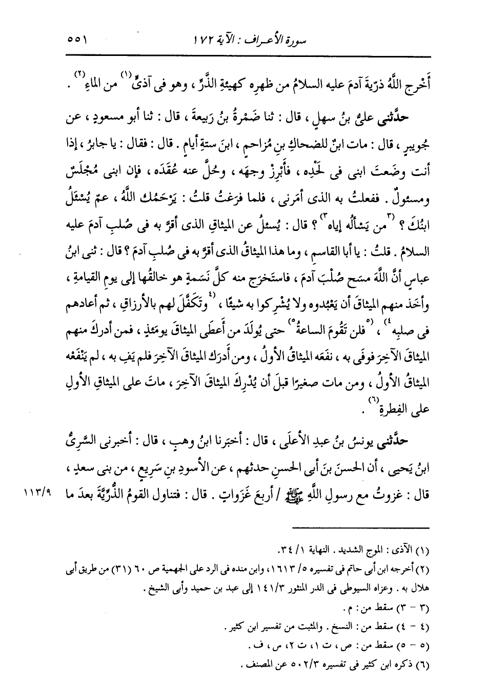 حَدَّثَنِي عَلِيُّ بْنُ سَهْلٍ، قَالَ: ثنا ضَمْرَةُ بْنُ رَبِيعَةَ، قَالَ: ثنا أَبُو مَسْعُودٍ، عَنْ جُوَيْبِرٍ، قَالَ: مَاتَ ابْنٌ لِلضَّحَّاكِ بْنِ مُزَاحِمٍ، ابْنُ سِتَّةِ أَيَّامٍ، قَالَ: فَقَالَ: يَا جَابِرُ إِذَا أَنْتَ وَضَعْتَ ابْنِي فِي لَحْدِهِ، فَأَبْرِزْ وَجْهَهُ، وَحُلَّ عَنْهُ عُقَدَهُ، فَإِنَّ ابْنِي مُجْلَسٌ وَمَسْئُولٌ، فَفَعَلْتُ بِهِ الَّذِي أَمَرَنِي، فَلَمَّا فَرَغْتُ، قُلْتُ: يَرْحَمُكَ اللَّهُ عَمَّ يُسْأَلُ ابْنُكَ؟ قَالَ: يُسْأَلُ عَنِ الْمِيثَاقِ الَّذِي أَقَرَّ بِهِ فِي صُلْبِ آدَمَ عَلَيْهِ السَّلَامُ. قُلْتُ: يَا أَبَا الْقَاسِمِ، وَمَا هَذَا الْمِيثَاقُ الَّذِي أَقَرَّ بِهِ فِي صُلْبِ آدَمَ؟ قَالَ: ثني ابْنُ عَبَّاسٍ «أَنَّ §اللَّهَ مَسَحَ صُلْبَ آدَمَ، فَاسْتَخْرَجَ مِنْهُ كُلَّ نَسَمَةٍ هُوَ خَالِقُهَا إِلَى يَوْمِ الْقِيَامَةِ، وَأَخَذَ مِنْهُمُ الْمِيثَاقَ أَنْ يَعْبُدُوهُ، وَلَا يُشْرِكُوا بِهِ شَيْئًا، فَلَنْ تَقُومَ السَّاعَةُ حَتَّى يُولَدَ مَنْ أَعْطَى الْمِيثَاقَ يَوْمَئِذٍ، فَمَنْ أَدْرَكَ مِنْهُمُ الْمِيثَاقَ الْآخَرَ فَوَفَّى بِهِ نَفَعَهُ الْمِيثَاقُ الْأَوَّلُ، وَمَنْ أَدْرَكَ الْمِيثَاقَ الْآخَرَ فَلَمْ يَفِ بِهِ لَمْ يَنْفَعْهُ الْمِيثَاقُ الْأَوَّلُ، وَمَنْ مَاتَ صَغِيرًا قَبْلَ أَنْ يُدْرِكَ الْمِيثَاقَ الْآخَرَ مَاتَ عَلَى الْمِيثَاقِ الْأَوَّلِ عَلَى الْفِطْرَةِ»