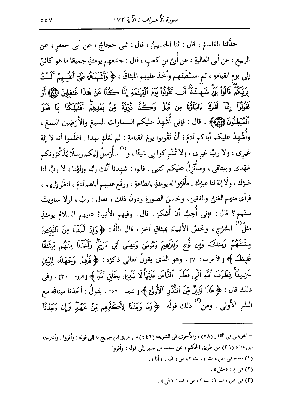 حَدَّثَنَا الْقَاسِمُ، قَالَ: ثنا الْحُسَيْنُ، قَالَ: ثني حَجَّاجٌ، عَنْ أَبِي جَعْفَرٍ، عَنِ الرَّبِيعِ، عَنْ أَبِي الْعَالِيَةِ، عَنْ أُبَيِّ بْنِ كَعْبٍ، قَالَ: " §جَمَعَهُمْ يَوْمَئِذٍ جَمِيعًا مَا هُوَ كَائِنٌ إِلَى يَوْمِ الْقِيَامَةِ، ثُمَّ اسْتَنْطَقَهُمْ، وَأَخَذَ عَلَيْهِمُ الْمِيثَاقَ {وَأَشْهَدَهُمْ عَلَى أَنْفُسِهِمْ أَلَسْتُ بِرَبِّكُمْ قَالُوا بَلَى شَهِدْنَا أَنْ تَقُولُوا يَوْمَ الْقِيَامَةِ إِنَّا كُنَّا عَنْ هَذَا غَافِلِينَ أَوْ تَقُولُوا إِنَّمَا أَشْرَكَ آبَاؤُنَا مِنْ قَبْلُ وَكُنَّا ذُرِّيَّةً مِنْ بَعْدِهِمْ أَفَتُهْلِكُنَا بِمَا فَعَلَ الْمُبْطِلُونَ} [الأعراف: 173] قَالَ: فَإِنِّي أُشْهِدُ عَلَيْكُمُ السَّمَوَاتِ السَّبْعِ وَالْأَرَضِينَ السَّبْعِ، وَأُشْهِدُ عَلَيْكُمْ أَبَاكُمْ آدَمَ أَنْ تَقُولُوا يَوْمَ الْقِيَامَةِ لَمْ نَعْلَمْ بِهَذَا، اعْلَمُوا أَنَّهُ لَا إِلَهَ غَيْرِي، وَلَا رَبَّ غَيْرِي، وَلَا تُشْرِكُوا بِي شَيْئًا، وَسَأُرْسِلُ إِلَيْكُمْ رُسُلًا يُذَكِّرُونَكُمْ عَهْدِي وَمِيثَاقِي، وَسَأُنْزِلُ عَلَيْكُمْ كُتُبِي، قَالُوا: شَهِدْنَا أَنَّكَ رَبُّنَا وَإِلَهُنَا، لَا رَبَّ لَنَا غَيْرُكَ، وَلَا إِلَهَ لَنَا غَيْرُكَ. فَأَقَرُّوا لَهُ يَوْمَئِذٍ بِالطَّاعَةِ، وَرَفَعَ عَلَيْهِمْ أَبَاهُمْ آدَمَ، فَنَظَرَ إِلَيْهِمْ، فَرَأَى مِنْهُمُ الْغَنِيَّ وَالْفَقِيرَ، وَحَسَنَ الصُّورَةِ، وَدُونَ ذَلِكَ، فَقَالَ: رَبِّ لَوْلَا سَاوَيْتَ بَيْنَهُمْ، قَالَ: فَإِنِّي أُحِبُّ أَنْ أُشْكَرَ. قَالَ: وَفِيهِمُ الْأَنْبِيَاءُ عَلَيْهِمُ السَّلَامُ يَوْمَئِذٍ مِثْلُ السُّرُجِ. وَخَصَّ الْأَنْبِيَاءَ بِمِيثَاقٍ آخَرَ، قَالَ اللَّهُ: {وَإِذْ أَخَذْنَا مِنَ النَّبِيِّينَ مِيثَاقَهُمْ وَمِنْكَ وَمِنْ نُوحٍ وَإِبْرَاهِيمَ وَمُوسَى وَعِيسَى ابْنِ مَرْيَمَ وَأَخَذْنَا مِنْهُمْ مِيثَاقًا غَلِيظًا} [الأحزاب: 7] وَهُوَ الَّذِي يَقُولُ تَعَالَى ذِكْرُهُ: {فَأَقِمْ وَجْهَكَ لِلدَّيْنِ حَنِيفًا فِطْرَةَ اللَّهِ الَّتِي فَطَرَ النَّاسَ عَلَيْهَا لَا تَبْدِيلَ لِخَلْقِ اللَّهِ} [الروم: 30] وَفِي ذَلِكَ قَالَ: {هَذَا نَذِيرٌ مِنَ النُّذُرِ الْأُولَى} [النجم: 56] يَقُولُ: أَخَذْنَا مِيثَاقَهُ مَعَ النُّذُرِ الْأُولَى، وَمِنْ ذَلِكَ قَوْلُهُ: {وَمَا وَجَدْنَا لِأَكْثَرِهِمْ مِنْ عَهْدٍ وَإِنْ وَجَدْنَا -[558]- أَكْثَرَهُمْ لَفَاسِقِينَ} [الأعراف: 102] ، {ثُمَّ بَعَثْنَا مِنْ بَعْدِهِ رُسُلًا إِلَى قَوْمِهِمْ فَجَاءُوهُمْ بِالْبَيِّنَاتِ فَمَا كَانُوا لِيُؤْمِنُوا بِمَا كَذَّبُوا بِهِ مِنْ قَبْلُ} قَالَ: كَانَ فِي عَلِمِهِ يَوْمَ أَقَرُّوا بِهِ مَنْ يُصَدِّقُ وَمَنْ يُكَذِّبُ "
