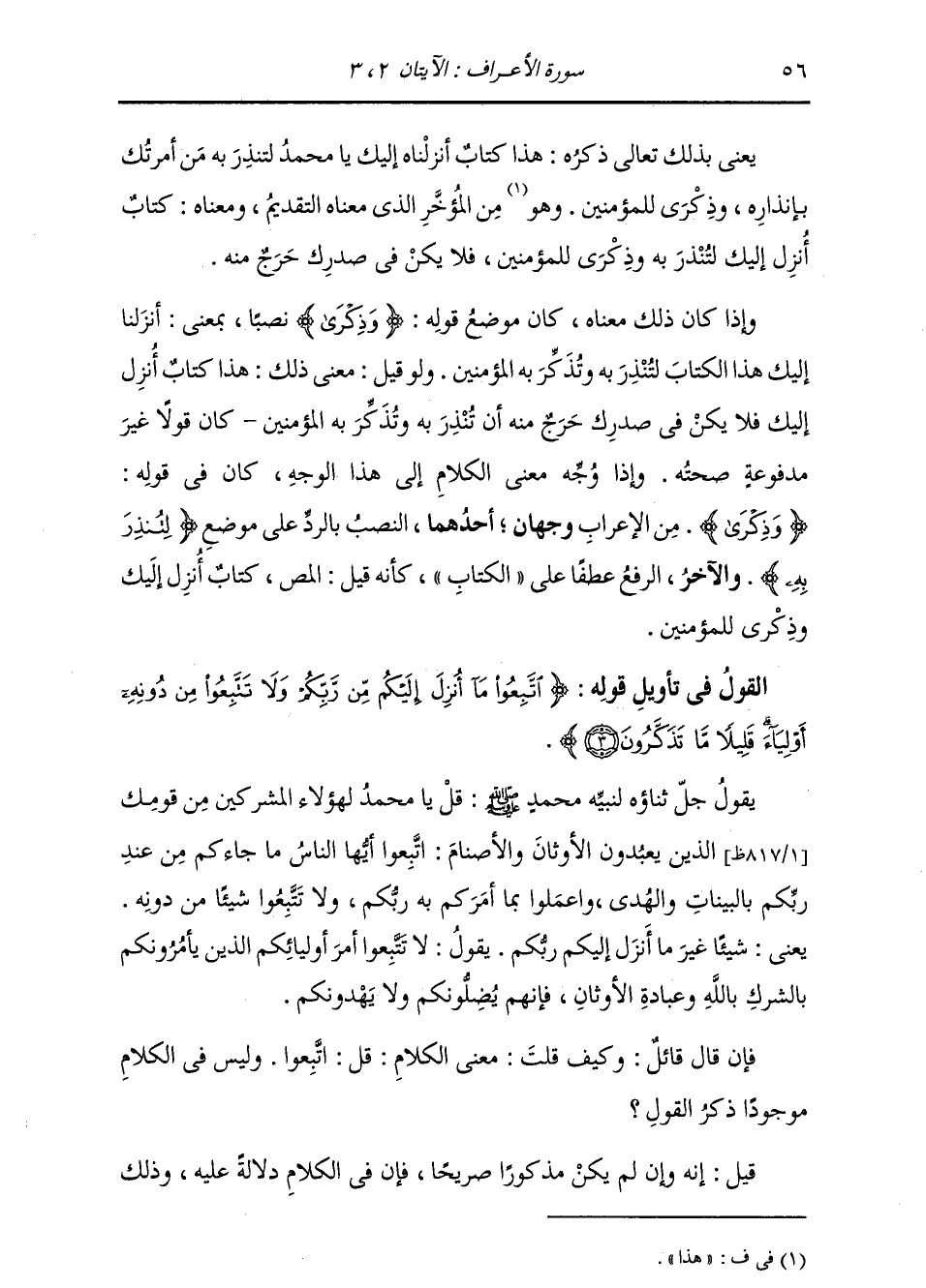 يَعْنِي بِذَلِكَ تَعَالَى ذِكْرُهُ: هَذَا كِتَابٌ أَنْزَلْنَاهُ إِلَيْكَ يَا مُحَمَّدُ لِتُنْذِرَ بِهِ مَنْ أَمَرْتُكَ بِإِنْذَارِهِ، {وَذِكْرَى لِلْمُؤْمِنِينَ} [الأعراف: 2] : وَهُوَ مِنَ الْمُؤَخَّرِ الَّذِي مَعْنَاهُ التَّقْدِيمُ، وَمَعْنَاهُ: كِتَابٌ أُنْزِلَ إِلَيْكَ لِتُنْذِرَ بِهِ، وَذِكْرٌ لِلْمُؤْمِنِينَ، فَلَا يَكُنْ فِي صَدْرِكَ حَرَجٌ مِنْهُ. وَإِذَا كَانَ ذَلِكَ مَعْنَاهُ كَانَ مَوْضِعَ قَوْلِهِ: {وَذِكْرَى} [الأعراف: 2] نَصْبًا بِمَعْنَى: أَنْزَلْنَا إِلَيْكَ هَذَا الْكِتَابَ لِتُنْذِرَ بِهِ، وَتُذَكِّرَ بِهِ الْمُؤْمِنِينَ. وَلَوْ قِيلَ: مَعْنَى ذَلِكَ: هَذَا كِتَابٌ أُنْزِلَ إِلَيْكَ فَلَا يَكُنْ فِي صَدْرِكَ حَرَجٌ مِنْهُ أَنْ تُنْذِرَ بِهِ وَتُذَكِّرَ بِهِ الْمُؤْمِنِينَ، كَانَ قَوْلًا غَيْرَ مَدْفُوعَةٍ صِحَّتُهُ. وَإِذَا وُجِّهَ مَعْنَى الْكَلَامِ إِلَى هَذَا الْوَجْهِ كَانَ فِي قَوْلِهِ: {وَذِكْرًى} [الأعراف: 2] مِنَ الْإِعْرَابِ وَجْهَانِ: أَحَدُهُمَا النَّصْبُ بِالرَّدِّ عَلَى مَوْضِعِ لِتُنْذِرَ بِهِ، وَالْآخَرُ الرَّفْعُ عَطْفًا عَلَى الْكِتَابِ، كَأَنَّهُ قِيلَ: المص، كِتَابٌ أُنْزِلَ إِلَيْكَ وَذِكْرًى لِلْمُؤْمِنِينَ