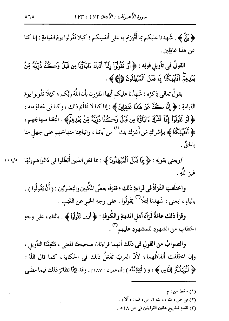 §الْقَوْلُ فِي تَأْوِيلِ قَوْلِهِ تَعَالَى: {أَوْ تَقُولُوا إِنَّمَا أَشْرَكَ آبَاؤُنَا مِنْ قَبْلُ وَكُنَّا ذُرِّيَّةً مِنْ بَعْدِهِمْ أَفَتُهْلِكُنَا بِمَا فَعَلَ الْمُبْطِلُونَ} [الأعراف: 173] يَقُولُ تَعَالَى ذِكْرُهُ: شَهِدْنَا عَلَيْكُمْ أَيُّهَا الْمُقِرُّونَ بِأَنَّ اللَّهَ رَبُّكُمْ، كَيْلَا تَقُولُوا يَوْمَ الْقِيَامَةِ: إِنَّا كُنَّا عَنْ هَذَا غَافِلِينَ، إِنَّا كُنَّا لَا نَعْلَمُ ذَلِكَ وَكُنَّا فِي غَفْلَةٍ مِنْهُ، أَوْ تَقُولُوا: {إِنَّمَا أَشْرَكَ آبَاؤُنَا مِنْ قَبْلُ وَكُنَّا ذُرِّيَّةً مِنْ بَعْدِهِمْ} [الأعراف: 173] اتَّبَعْنَا مِنْهَاجَهُمْ {أَفَتُهْلِكُنَا} [الأعراف: 173] بِإِشْرَاكِ مَنْ أَشْرَكَ مِنْ آبَائِنَا، وَاتِّبَاعِنَا مِنْهَاجَهُمْ عَلَى جَهْلٍ مِنَّا بِالْحَقِّ؟ . وَيَعْنِي بِقَوْلِهِ {بِمَا فَعَلَ الْمُبْطِلُونَ} [الأعراف: 173] بِمَا فَعَلَ الَّذِينَ أَبْطَلُوا فِي دَعْوَاهُمْ إِلَهًا غَيْرَ اللَّهِ. وَاخْتَلَفَتِ الْقُرَّاءُ فِي قِرَاءَةِ ذَلِكَ، فَقَرَأَهُ بَعْضُ الْمَكِّيِّينَ وَالْبَصْرِيِّينَ: (أَنْ يَقُولُوا) بِالْيَاءِ، بِمَعْنَى: شَهِدْنَا لِئَلَّا يَقُولُوا عَلَى وَجْهِ الْخَبَرِ عَنِ الْغَيْبِ. وَقَرَأَ ذَلِكَ عَامَّةُ قُرَّاءِ أَهْلِ الْمَدِينَةِ وَالْكُوفَةِ: {أَنْ تَقُولُوا} [البقرة: 235] بِالتَّاءِ عَلَى وَجْهِ الْخَطَّابِ مِنَ الشُّهُودِ لِلْمَشْهُودِ عَلَيْهِمْ. وَالصَّوَابُ مِنَ الْقَوْلِ فِي ذَلِكَ أَنَّهُمَا قِرَاءَتَانِ صَحِيحَتَا الْمَعْنَى مُتَّفِقَتَا التَّأْوِيلِ وَإِنِ اخْتَلَفَتْ أَلْفَاظُهُمَا؛ لِأَنَّ الْعَرَبَ تَفْعَلُ ذَلِكَ فِي الْحِكَايَةِ، كَمَا قَالَ اللَّهُ: {لَتُبَيِّنُنَّهُ لِلنَّاسِ} [آل عمران: 187] وَلَيُبَيِّنُنَّهُ، وَقَدْ بَيَّنَّا نَظَائِرَ ذَلِكَ فِيمَا مَضَى