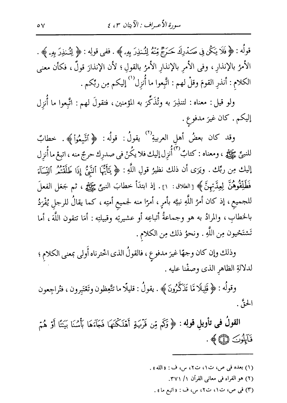 قَوْلُهُ: {فَلَا يَكُنْ فِي صَدْرِكَ حَرَجٌ مِنْهُ لِتُنْذِرَ بِهِ} [الأعراف: 2] ، فَفِي قَوْلِهِ: (لِتُنْذِرَ بِهِ) الْأَمْرُ بِالْإِنْذَارِ، وَفِي الْأَمْرِ بِالْإِنْذَارِ الْأَمْرُ بِالْقَوْلِ لِأَنَّ الْإِنْذَارَ قَوْلٌ. فَكَانَ مَعْنَى الْكَلَامِ: أَنْذِرِ الْقَوْمَ وَقُلْ لَهُمِ: اتَّبِعُوا مَا أُنْزِلَ إِلَيْكُمْ، كَانَ غَيْرَ مَدْفُوعٍ. وَقَدْ كَانَ بَعْضُ أَهْلِ الْعَرَبِيَّةِ يَقُولُ: قَوْلُهُ: {اتَّبِعُوا} [البقرة: 166] خِطَابٌ النَّبِيَّ صَلَّى اللهُ عَلَيْهِ وَسَلَّمَ، وَمَعْنَاهُ: كِتَابٌ أُنْزِلَ إِلَيْكَ، فَلَا يَكُنْ فِي صَدْرِكَ حَرَجٌ مِنْهُ، اتَّبِعْ مَا أُنْزِلَ إِلَيْكَ مِنْ رَبِّكَ. وَيَرَى أَنَّ ذَلِكَ نَظِيرُ قَوْلِ اللَّهِ: {يَا أَيُّهَا النَّبِيُّ إِذَا طَلَّقْتُمُ النِّسَاءَ فَطَلِّقُوهُنَّ لِعِدَّتِهِنَّ} [الطلاق: 1] ، إِذِ ابْتَدَأَ خِطَابَ النَّبِيِّ صَلَّى اللهُ عَلَيْهِ وَسَلَّمَ، ثُمَّ جَعَلَ الْفِعْلَ لِلْجَمِيعِ، إِذْ كَانَ أَمْرُ اللَّهِ نَبِيَّهُ بِأَمْرٍ أَمْرًا مِنْهُ لِجَمِيعِ أُمَّتِهِ، كَمَا يُقَالُ لِلرَّجُلِ يُفْرَدُ بِالْخِطَابِ وَالْمُرَادُ بِهِ هُوَ وَجَمَاعَةُ أَتْبَاعِهِ أَوْ عَشِيرَتِهِ وَقَبِيلَتِهِ: أَمَا تَتَّقُونَ اللَّهَ؟ أَمَا تَسْتَحْيَوْنَ مِنَ اللَّهِ؟ وَنَحْوُ ذَلِكَ مِنَ الْكَلَامِ. وَذَلِكَ وَإِنْ كَانَ وَجْهًا غَيْرَ مَدْفُوعٍ، فَالْقَوْلُ الَّذِي اخْتَرْنَاهُ أَوْلَى بِمَعْنَى الْكَلَامِ لِدَلَالَةِ الظَّاهِرِ الَّذِي وَصَفْنَا عَلَيْهِ وَقَوْلُهُ: {قَلِيلًا مَا تَذَكَّرُونَ} [الأعراف: 3] يَقُولُ: قَلِيلًا مَا تَتَّعِظُونَ وَتَعْتَبِرُونَ، فَتُرَاجِعُونَ الْحَقَّ.