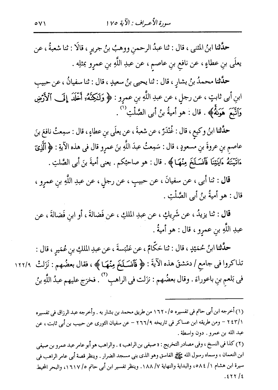 حَدَّثَنَا ابْنُ حُمَيْدٍ، قَالَ: ثنا حَكَّامٌ، عَنْ عَنْبَسَةَ، عَنْ عَبْدِ الْمَلِكِ بْنِ عُمَيْرٍ، قَالَ: تَذَاكَرُوا فِي جَامِعِ دِمَشْقَ هَذِهِ الْآيَةَ: {§فَانْسَلَخَ مِنْهَا} [الأعراف: 175] فَقَالَ بَعْضُهُمْ: نَزَلَتْ فِي بَلْعَمَ بْنِ بَاعُورَاءَ، وَقَالَ بَعْضُهُمْ: نَزَلَتْ فِي الرَّاهِبِ. فَخَرَجَ عَلَيْهِمْ عَبْدُ اللَّهِ بْنُ -[572]- عَمْرِو بْنِ الْعَاصِ، فَقَالُوا: فِيمَنْ نَزَلَتْ هَذِهِ؟ قَالَ: «نَزَلَتْ فِي أُمَيَّةَ بْنِ أَبِي الصَّلْتِ الثَّقَفِيِّ»