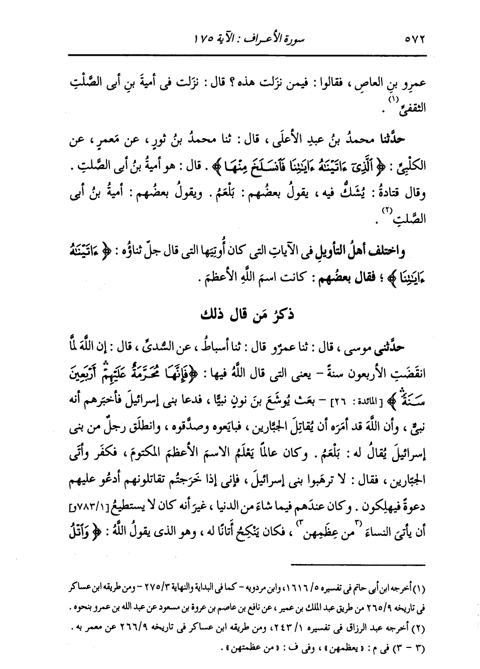 حَدَّثَنَا مُحَمَّدُ بْنُ عَبْدِ الْأَعْلَى، قَالَ: ثنا مُحَمَّدُ بْنُ ثَوْرٍ، عَنْ مَعْمَرٍ، عَنِ الْكَلْبِيِّ: " {§الَّذِي آتَيْنَاهُ آيَاتِنَا فَانْسَلَخَ مِنْهَا} [الأعراف: 175] قَالَ: هُوَ أُمَيَّةُ بْنُ أَبِي الصَّلْتِ "، وَقَالَ قَتَادَةُ: يَشُكُّ فِيهِ، يَقُولُ بَعْضُهُمْ: بَلْعَمُ، وَيَقُولُ بَعْضُهُمْ: أُمَيَّةُ بْنُ أَبِي الصَّلْتِ وَاخْتَلَفَ أَهْلُ التَّأْوِيلِ فِي الْآيَاتِ الَّتِي كَانَ أُوتِيهَا الَّتِي قَالَ جَلَّ ثَنَاؤُهُ: {آتَيْنَاهُ آيَاتِنَا} [الأعراف: 175] فَقَالَ بَعْضُهُمْ: كَانَتِ اسْمَ اللَّهِ الْأَعْظَمِ