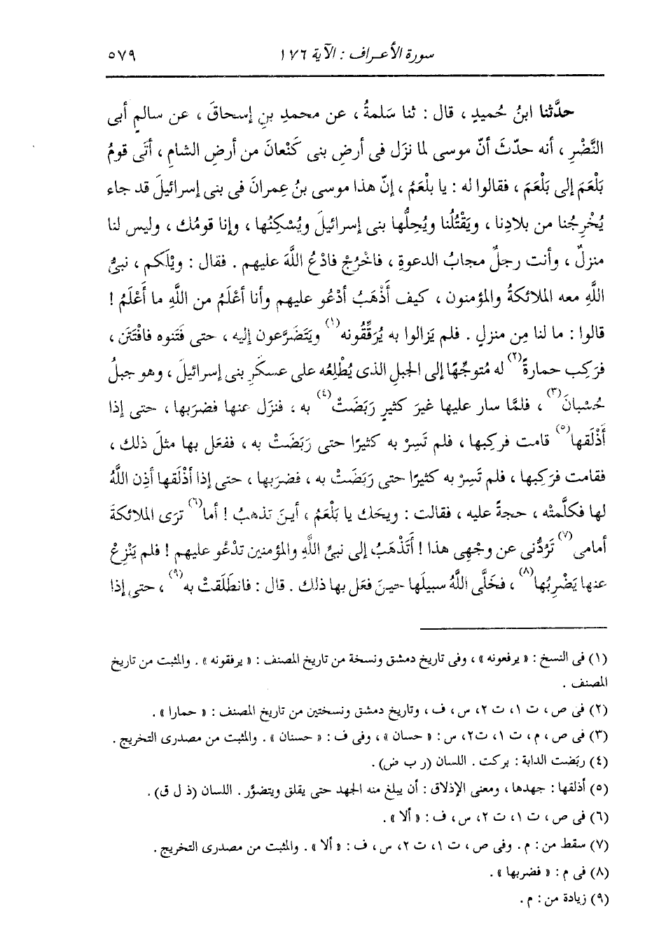 حَدَّثَنَا ابْنُ حُمَيْدٍ، قَالَ: ثنا سَلَمَةُ، عَنْ مُحَمَّدِ بْنِ إِسْحَاقَ، عَنْ سَالِمٍ أَبِي النَّضْرِ، أَنَّهُ حَدَّثَ: " أَنَّ §مُوسَى لَمَّا نَزَلَ فِي أَرْضِ بَنِي كَنْعَانَ مِنْ أَرْضِ الشَّامِ أَتَى قَوْمُ بَلْعَمَ إِلَى بَلْعَمَ، فَقَالُوا لَهُ: يَا بَلْعَمُ إِنَّ هَذَا مُوسَى بْنَ عِمْرَانَ فِي بَنِي إِسْرَائِيلَ قَدْ جَاءَ يُخْرِجُنَا مِنْ بِلَادِنَا وَيَقْتُلُنَا وَيُحِلُّهَا بَنِي إِسْرَائِيلَ وَيَسْكُنُهَا، وَإِنَّا قَوْمُكَ، وَلَيْسَ لَنَا مَنْزِلٌ، وَأَنْتَ رَجُلٌ مُجَابُ الدَّعْوَةِ، فَاخْرُجْ وَادْعُ اللَّهَ عَلَيْهِمْ، فَقَالَ: وَيْلَكُمْ نَبِيُّ اللَّهِ مَعَهُ الْمَلَائِكَةُ وَالْمُؤْمِنُونَ، كَيْفَ أَذْهَبُ أَدْعُو عَلَيْهِمْ وَأَنَا أَعْلَمُ مِنَ اللَّهِ مَا أَعْلَمُ؟ قَالُوا: مَا لَنَا مِنْ مَنْزِلٍ. فَلَمْ يَزَالُوا بِهِ يَرْفَعُونَهُ وَيَتَضَرَّعُونَ إِلَيْهِ حَتَّى فَتَنُوهُ فَافْتُتِنَ. فَرَكِبَ حِمَارَةً لَهُ مُتَوَجِّهًا إِلَى الْجَبَلِ الَّذِي يُطْلِعُهُ عَلَى عَسْكَرِ بَنِي إِسْرَائِيلَ. وَهُوَ جَبَلُ حَسَّانَ، فَلَمَّا سَارَ عَلَيْهَا غَيْرَ كَثِيرٍ رَبَضَتْ بِهِ، فَنَزَلَ عَنْهَا، فَضَرَبَهَا، حَتَّى إِذَا أَذْلَقَهَا قَامَتْ فَرَكِبَهَا فَلَمْ تَسِرْ بِهِ كَثِيرًا حَتَّى رَبَضَتْ بِهِ. فَفَعَلَ بِهَا مِثْلَ ذَلِكَ، فَقَامَتْ فَرَكِبَهَا فَلَمْ تَسِرْ بِهِ كَثِيرًا حَتَّى رَبَضَتْ بِهِ. فَضَرَبَهَا حَتَّى إِذَا أَذْلَقَهَا أَذِنَ اللَّهُ لَهَا، فَكَلَّمَتْهُ حُجَّةً عَلَيْهِ، قَالَتْ: وَيْحَكَ يَا بَلْعَمُ أَيْنَ تَذْهَبُ؟ أَمَا تَرَى الْمَلَائِكَةَ تَرُدُّنِي عَنْ وَجْهِيَ هَذَا؟ أَتَذْهَبُ إِلَى نَبِيِّ اللَّهِ وَالْمُؤْمِنِينَ تَدْعُو عَلَيْهِمْ، فَلَمْ يَنْزِعْ عَنْهَا فَضَرَبَهَا فَخَلَّى اللَّهُ سَبِيلَهَا حِينَ فَعَلَ بِهَا ذَلِكَ. قَالَ: فَانْطَلَقْتُ بِهِ حَتَّى إِذَا