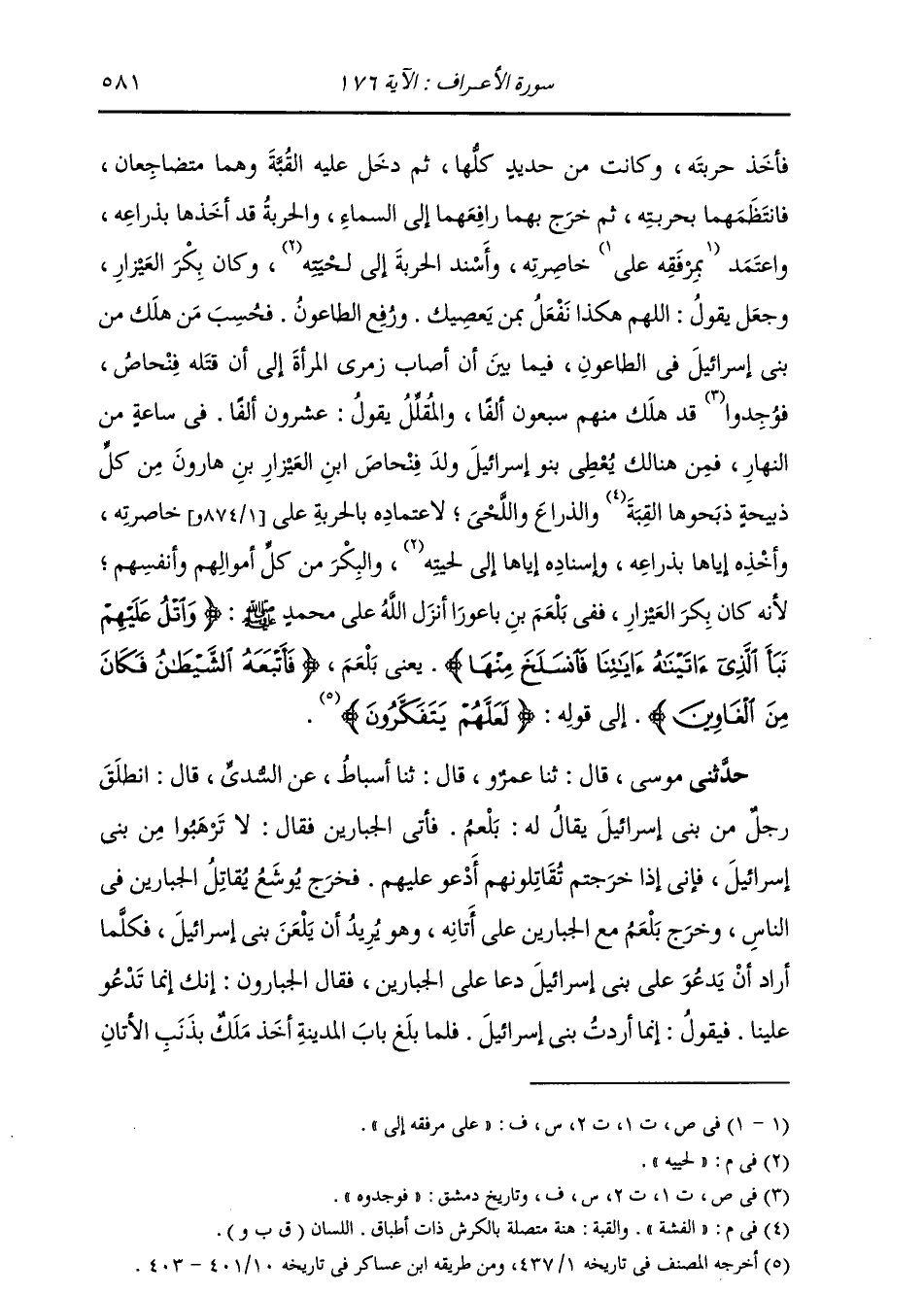 حَدَّثَنِي مُوسَى، قَالَ: ثنا عَمْرٌو، قَالَ: ثنا أَسْبَاطٌ، عَنِ السُّدِّيِّ، قَالَ: " §انْطَلَقَ رَجُلٌ مِنْ بَنِي إِسْرَائِيلَ يُقَالُ لَهُ بَلْعَمُ، فَأَتَى الْجَبَّارِينَ، فَقَالَ: لَا تَرْهَبُوا مِنْ بَنِي إِسْرَائِيلَ، فَإِنِّي إِذَا خَرَجْتُمْ تُقَاتِلُونَهُمْ أَدْعُو عَلَيْهِمْ، فَخَرَجَ يُوشَعُ يُقَاتِلُ الْجَبَّارِينَ فِي النَّاسِ. وَخَرَجَ بَلْعَمُ مَعَ الْجَبَّارِينَ عَلَى أَتَانِهِ وَهُوَ يُرِيدُ أَنْ يَلْعَنَ بَنِي إِسْرَائِيلَ، فَكُلَّمَا أَرَادَ أَنْ يَدْعُوَ عَلَى بَنِي إِسْرَائِيلَ دَعَا عَلَى الْجَبَّارِينَ، فَقَالَ الْجَبَّارُونَ: إِنَّكَ إِنَّمَا تَدْعُو عَلَيْنَا، فَيَقُولُ: إِنَّمَا أَرَدْتُ بَنِي إِسْرَائِيلَ. فَلَمَّا بَلَغَ بَابَ الْمَدِينَةِ أَخَذَ مَلَكٌ بِذَنَبِ الْأَتَانِ، -[582]- فَأَمْسَكَهَا، فَجَعَلَ يُحَرِّكُهَا فَلَا تَتَحَرَّكُ، فَلَمَّا أَكْثَرَ ضَرْبَهَا تَكَلَّمَتْ فَقَالَتْ: أَنْتَ تَنْكَحُنِي بِاللَّيْلِ وَتَرْكَبُنِي بِالنَّهَارِ؟ وَيْلِي مِنْكَ وَلَوْ أَنِّي أَطَقْتُ الْخُرُوجَ لَخَرَجْتُ، وَلَكِنْ هَذَا الْمَلَكُ يَحْبِسُنِي. وَفِي بَلْعَمَ يَقُولُ اللَّهُ: {وَاتْلُ عَلَيْهِمْ نَبَأَ الَّذِي آتَيْنَاهُ آيَاتِنَا} [الأعراف: 175] الْآيَةَ "