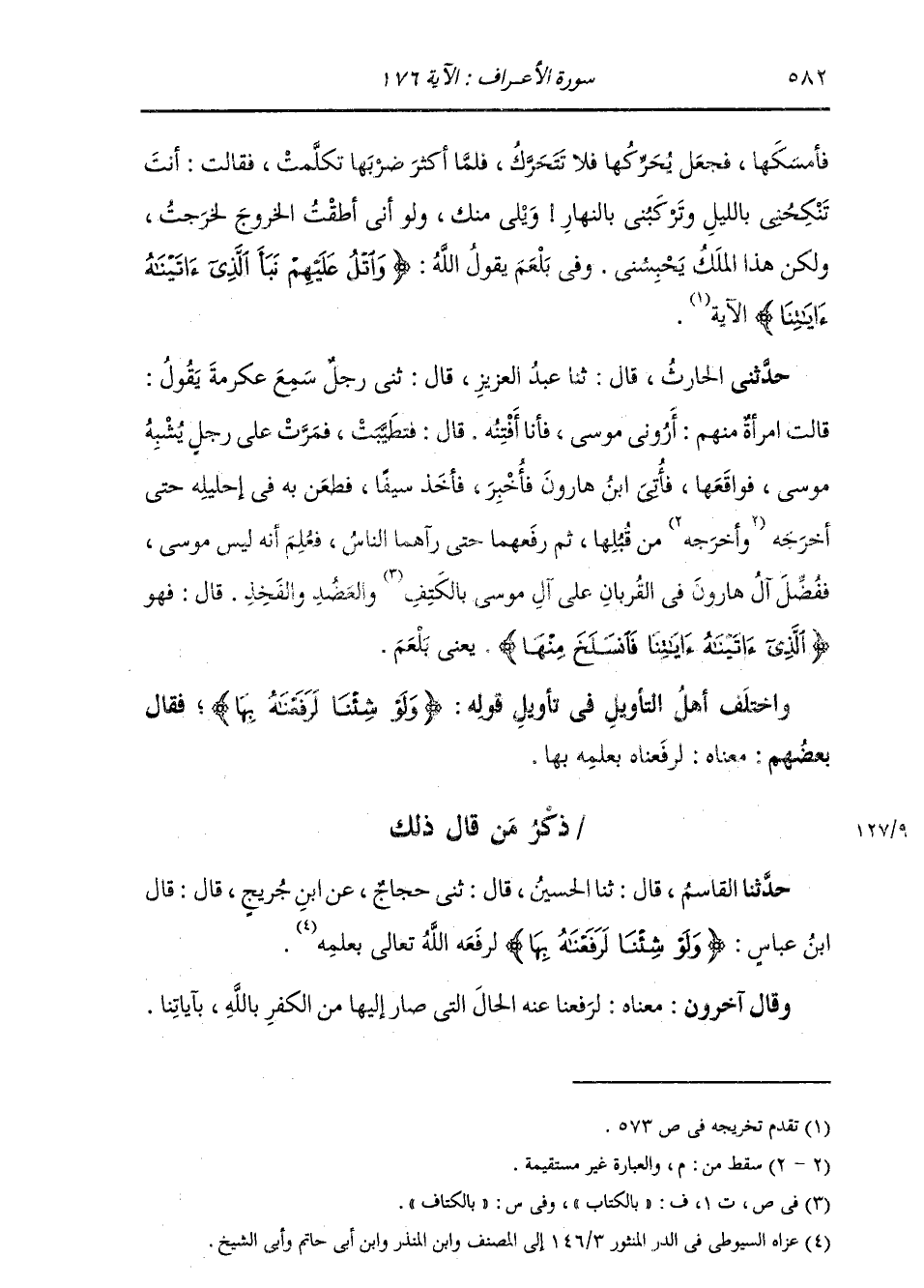 ذِكْرُ مَنْ قَالَ ذَلِكَ: حَدَّثَنَا الْقَاسِمُ، قَالَ: ثنا الْحُسَيْنُ، قَالَ: ثني حَجَّاجٌ، عَنِ ابْنِ جُرَيْجٍ، قَالَ: قَالَ ابْنُ عَبَّاسٍ: " {§وَلَوْ شِئْنَا لَرَفَعْنَاهُ بِهَا} [الأعراف: 176] لَرَفَعَهُ اللَّهُ تَعَالَى بِعِلْمِهِ " وَقَالَ آخَرُونَ: مَعْنَاهُ لَرَفَعْنَا عَنْهُ الْحَالَ الَّتِي صَارَ إِلَيْهَا مِنَ الْكُفْرِ بِاللَّهِ بِآيَاتِنَا