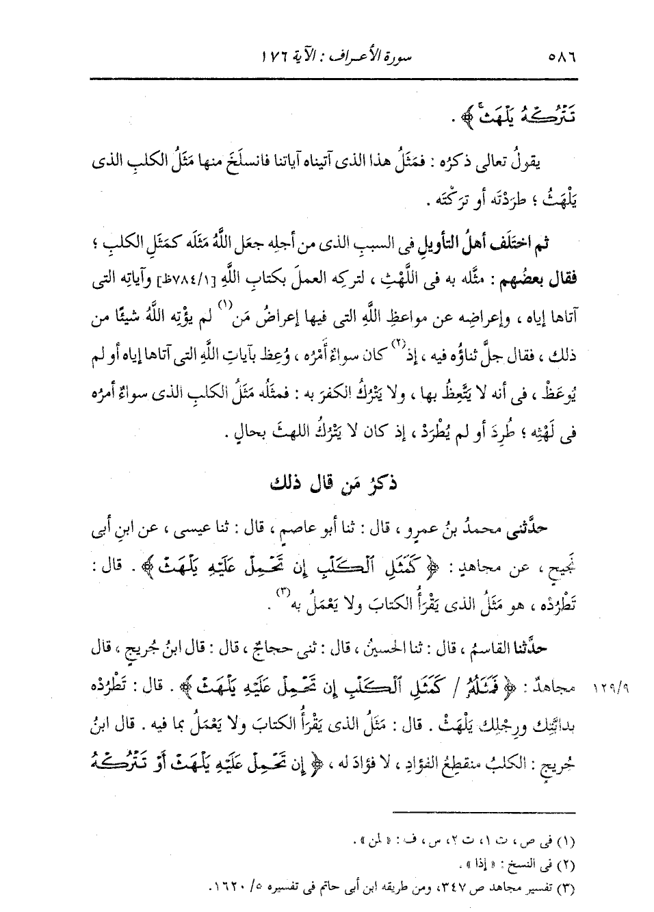 ذِكْرُ مَنْ قَالَ ذَلِكَ: حَدَّثَنِي مُحَمَّدُ بْنُ عَمْرٍو، قَالَ: ثنا أَبُو عَاصِمٍ، قَالَ: ثنا عِيسَى، عَنِ ابْنِ أَبِي نَجِيحٍ، عَنْ مُجَاهِدٍ: " {§كَمَثَلِ الْكَلْبِ إِنْ تَحْمِلْ عَلَيْهِ يَلْهَثْ} [الأعراف: 176] قَالَ: تَطْرُدُهُ، هُوَ مَثَلُ الَّذِي يَقْرَأُ الْكِتَابَ وَلَا يَعْمَلُ بِهِ "